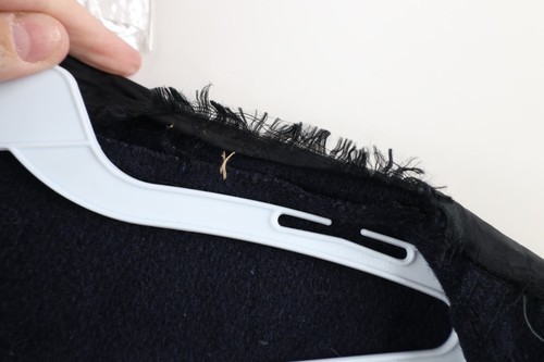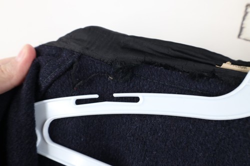 Missing left pocket button. Holes left arm/cuff. Holes/ripped/frayed inner collar. Collar, cuffs discolored. Color faded. Pilling. Name tag sewn into inner collar. USA made