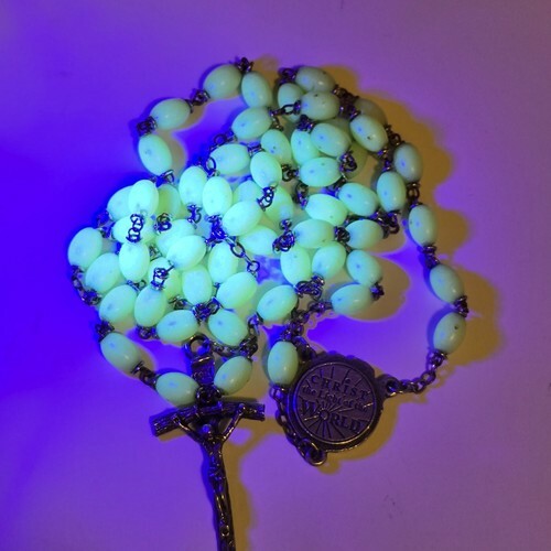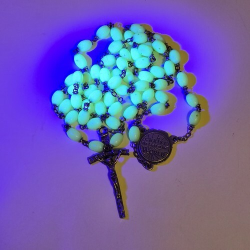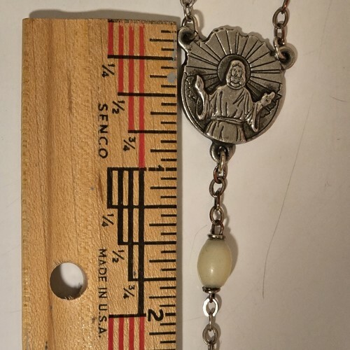 Vintage 1960s Chapel INRI Italy Crucifix Luminescent Catholic Rosary - Length 24.5" inch. Silver toned. This glows under a black light. Stunning Condition.