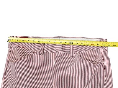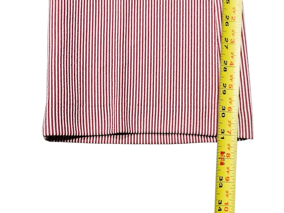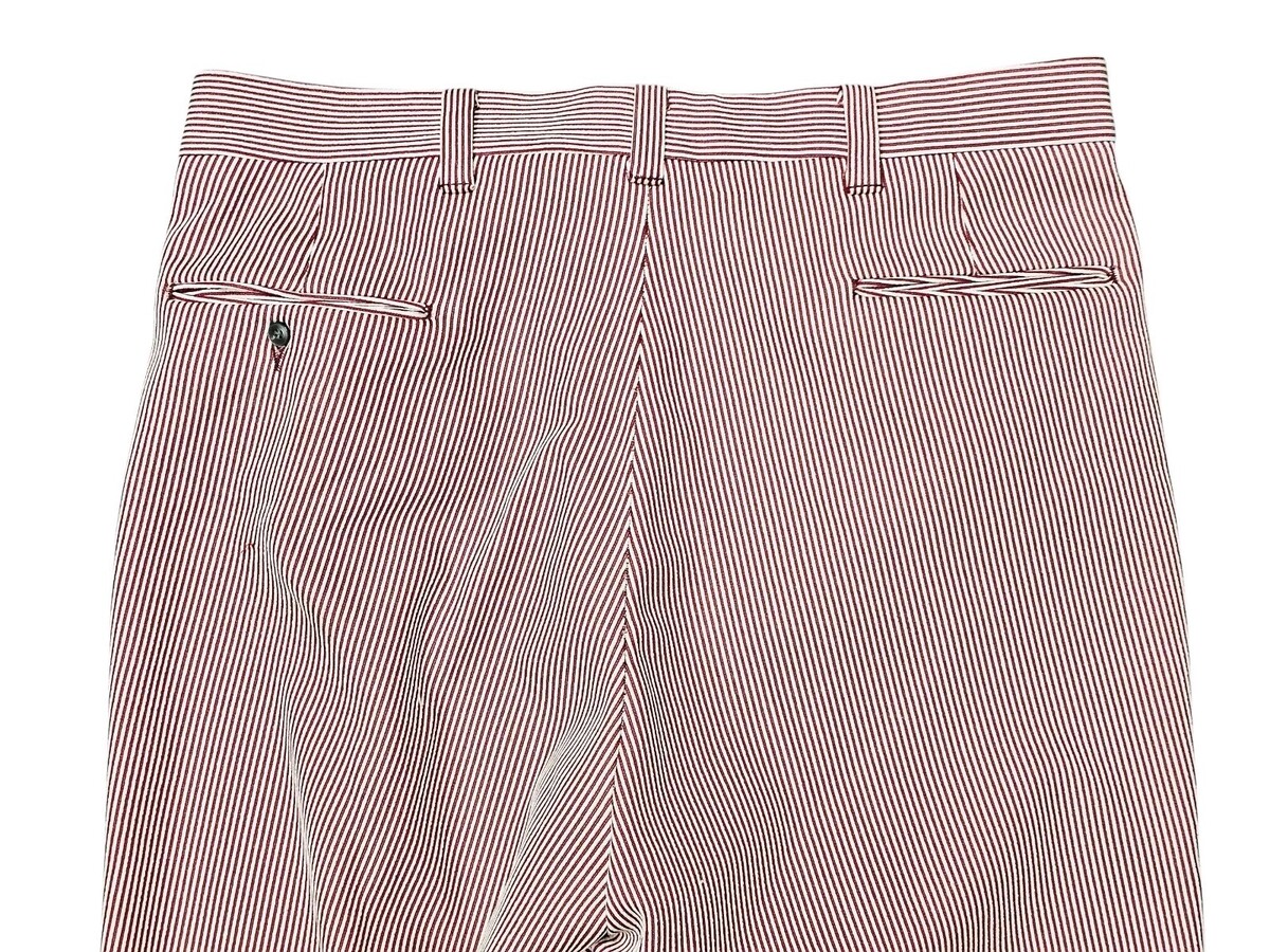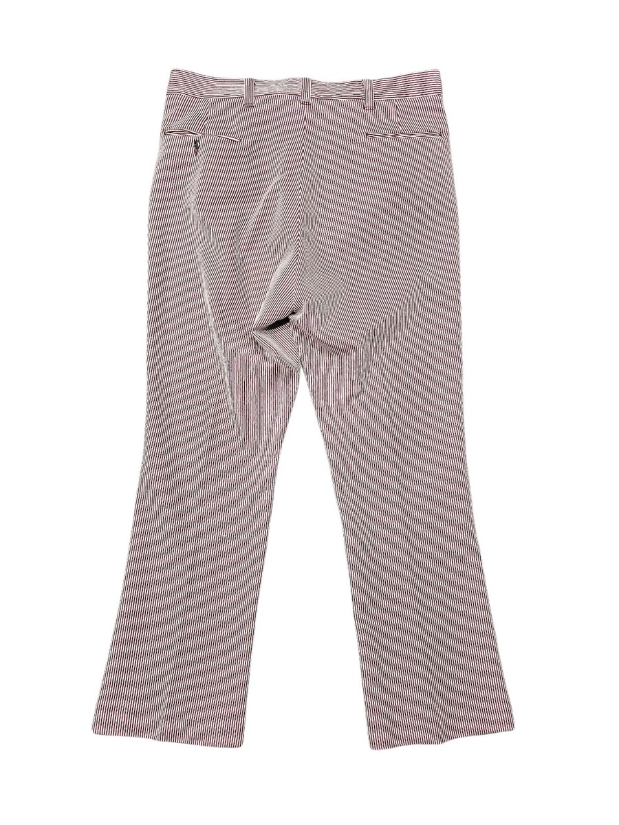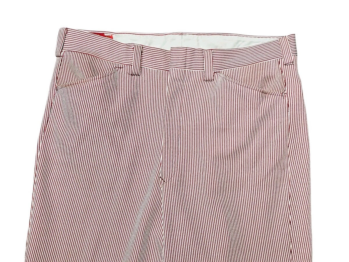 This product is a vintage pair of 60s Kings Road Give-N-Take stretchslak pants in a red and white candy cane striped design. With a mid-rise and flared leg style, these dress pants feature a 5-pocket design and a hook loop closure. Made of a comfortable and breathable cotton blend knit fabric, these pants are perfect for various occasions such as parties, formal events, and business meetings. The retro 60s theme adds a unique touch to the overall look, making them a standout piece in any man's wardrobe.