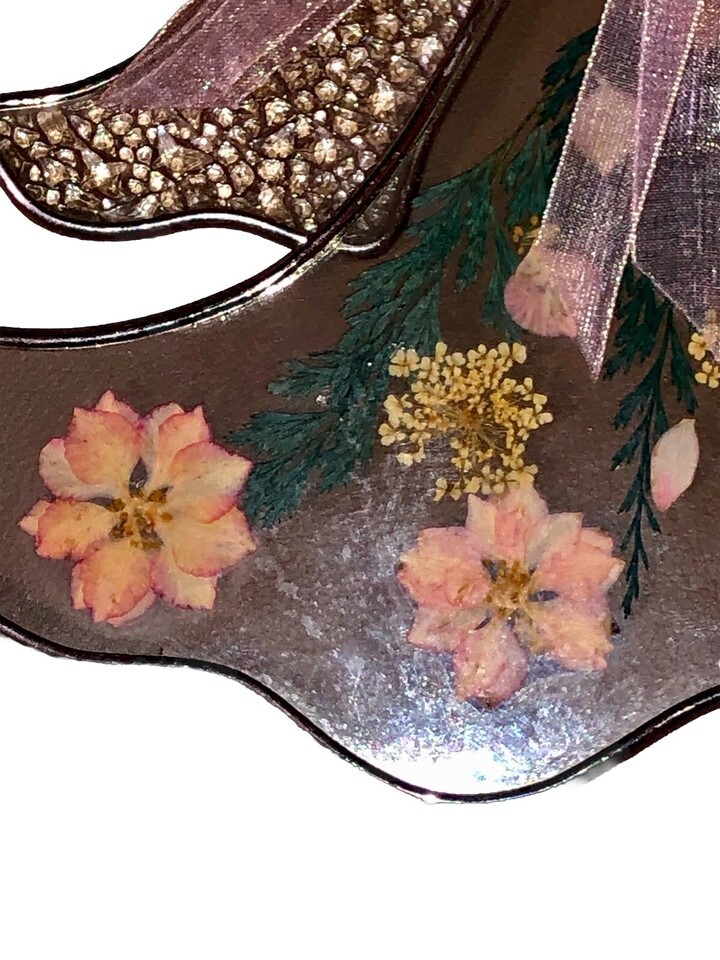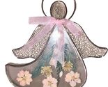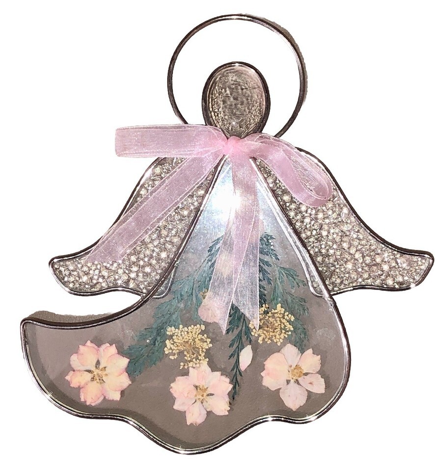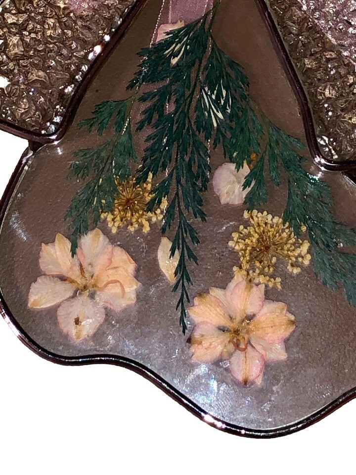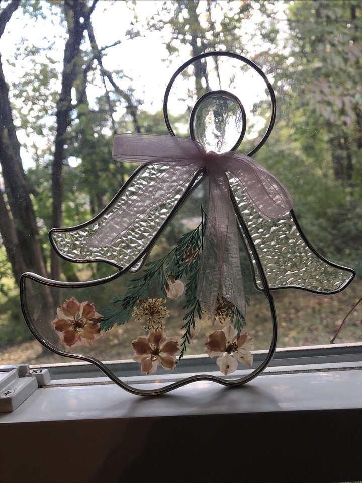 - Vintage 70’s Glass Pressed Dried Flowers ANGEL Sun Catcher Wall Hanging Pink Bow