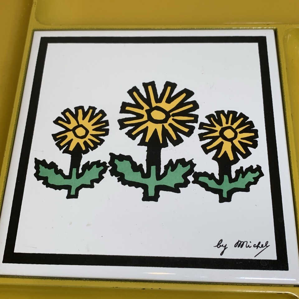Bring some bright retro charm to your table with this vintage 1970s divided snack tray featuring a bold pop-art flower tile signed ?by Michel.? The center is a ceramic trivet-style tile, surrounded by four molded yellow plastic compartments perfect for snacks, nuts, veggies, or party appetizers.