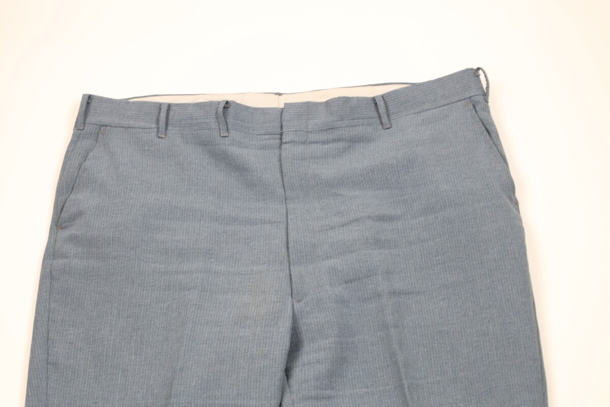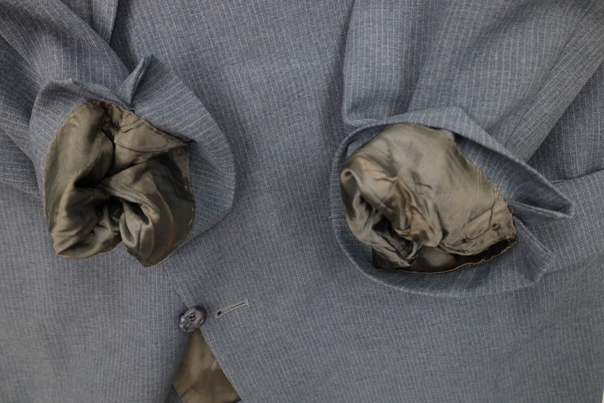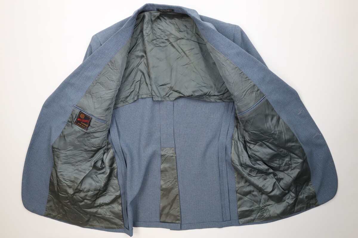 Jacket: Collar, cuffs, inner lining discolored. Pants: Inner lining cuffs discolored. Color faded. Pilling. Mended hole back bottom left leg. Loose threads back middle. Made in USA 19 inches shoulder to shoulder seam. 24.5 inches shoulder to cuff.