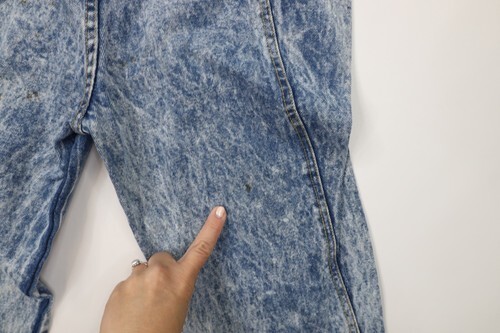 Stains throughout, and cuffs. Cuffs, waist discolored. Distressed and faded. Color faded. Loose threads waist. Made in USA