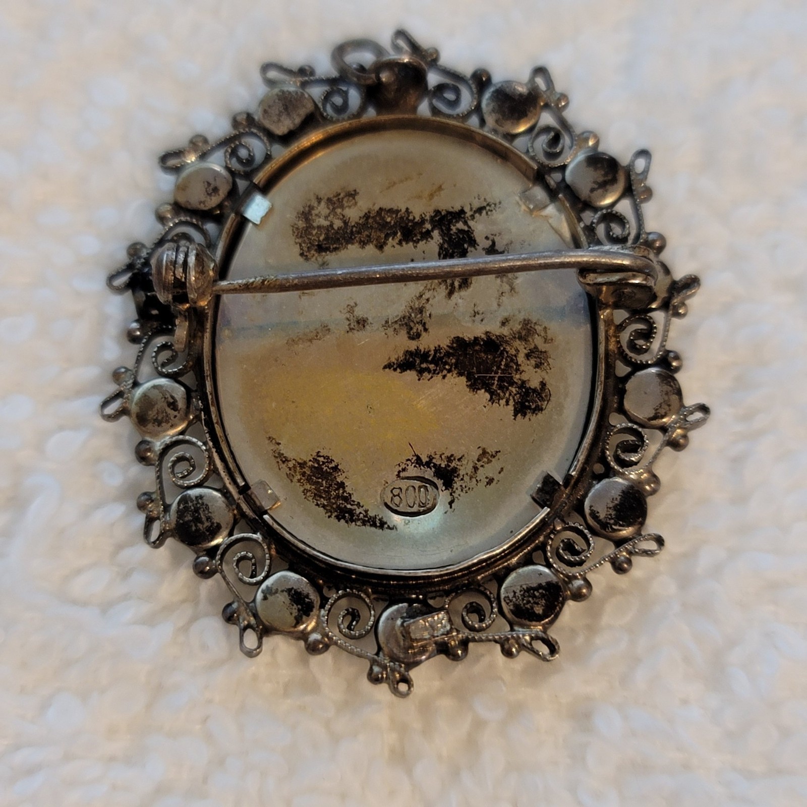 Stamped 800 on the reverse, indicating European silver content (80% purity), this brooch likely originates from Italy or another European country, where religious portrait jewelry was highly popular. A wonderful addition for collectors of devotional or antique religious jewelry.