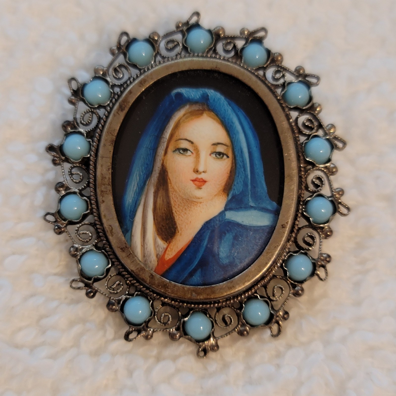 This exquisite vintage brooch features a finely hand-painted portrait of the Virgin Mary (Mother of God), set in an ornate 800 silver filigree frame accented with turquoise blue cabochons. The artistry of the painted miniature is delicate and devotional, making this piece both a wearable accessory and a meaningful keepsake.