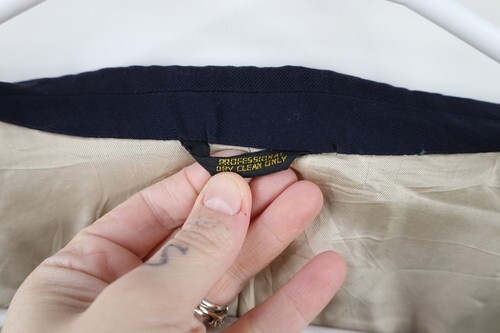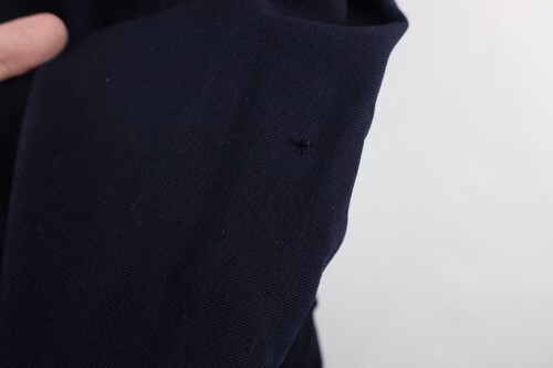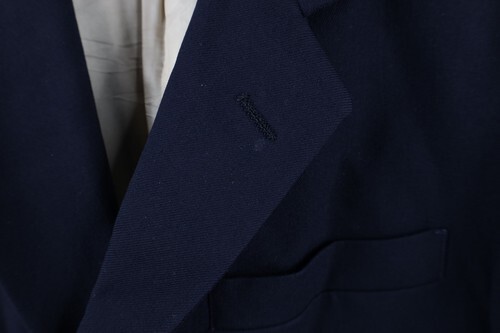 Broken button right cuff. Holes inner lining, left arm. Stains/blemishes throughout and inner lining. Inner lining, collar, cuffs discolored. Color faded. Thread bare inner lining. Made in USA. 17.5 inches shoulder seam to shoulder seam. 23 inches shoulder seam to cuff
