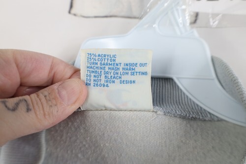 Logo left arm distressed. Stains, thread bare spots front. Graphics, color faded. Collar discolored. Pilling