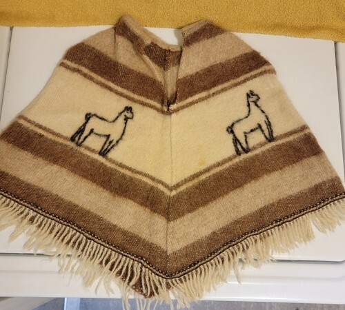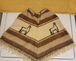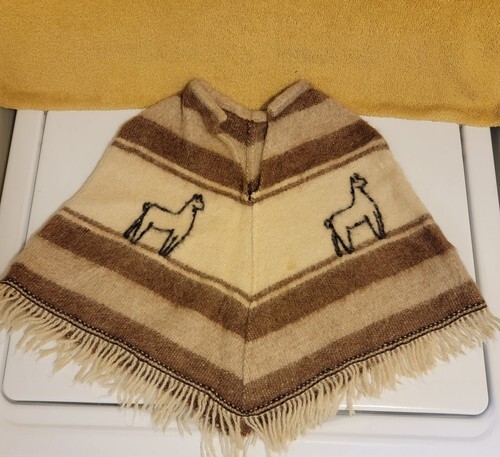 Vintage 80s Childs Woven 100% Alpaca Wool Brown / White Poncho with Lamas Baby 6M - 2T. Actual measurements: 6" neck, 15.5" Side length, 17" down the other side.