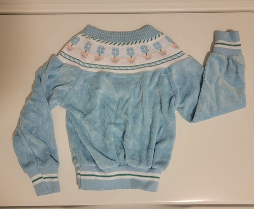 Vintage 80s Disney Winnie The Pooh Blue Fair Isle Floral Sweater - Terry cloth like material. Tag Size 4 Toddler. Actual measurements: 11" inch pit to pit, 13.5" length. Please go off measurements since this is very vintage!