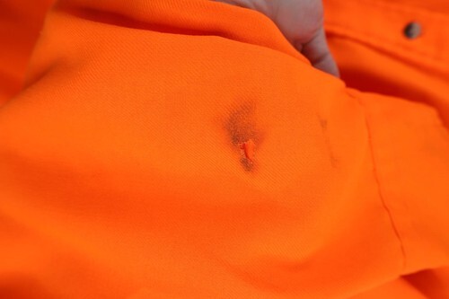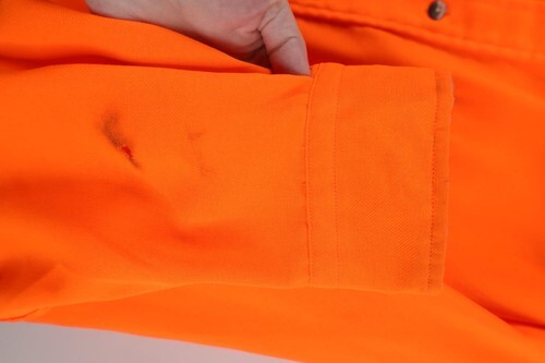 Hole left arm. Stains front, arms/cuffs. Collar, cuffs discolored. Color faded. Pilling. USA made