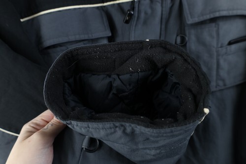 Dark lines front, back. Blemishes arms, hood. Color faded. Cuffs discolored. Inner lining pilled/matted. Loose thread left arm. Zipper pulls distressed