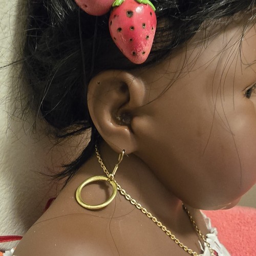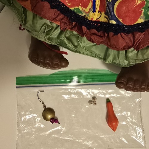 Stunning little girl, beautiful outfit. She has lots of little jewelry pieces, including: her fruit headband (I think) 2 bracelets, 1 gold tone cross necklace, 1 pair of gold dangle earrings, 1 single dangle Earring (the other is missing. Also, I don't know if this was part of her original outfit.) There are a few beads and 1 piece of fruit not attached to anything, so there in a separate bag.