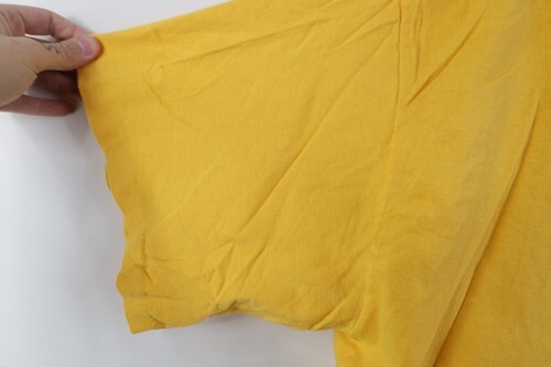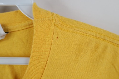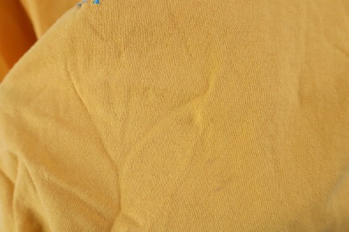 Stains front. Hole left shoulder. Shoulders stretched. Design distressed. Color faded. Pilling. Made in USA