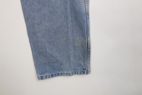 Stains throughout. Thread bare fly, back top, cuffs, pockets. Hole/thread bare crotch area. Distressed and faded. Waist tagged 34 but fits and measures size 32