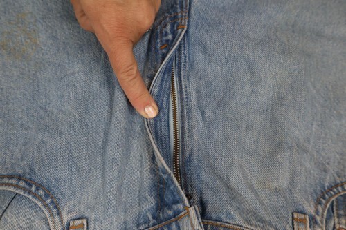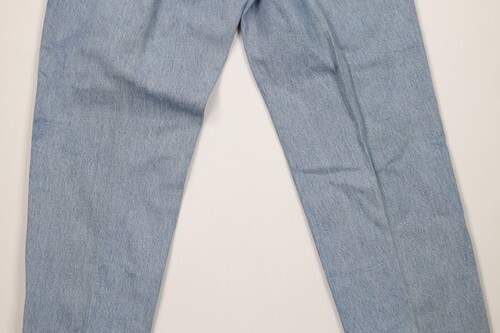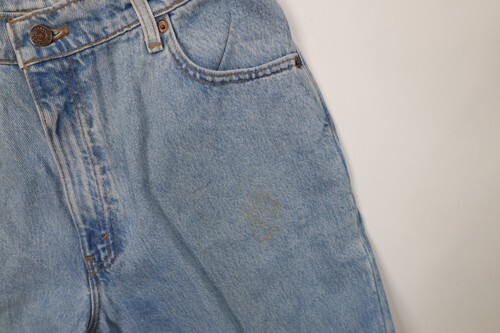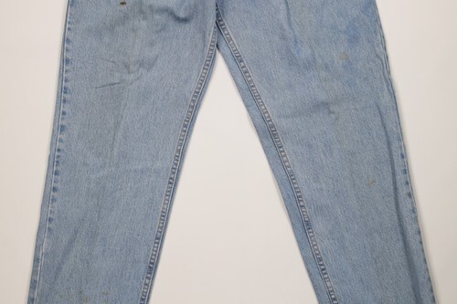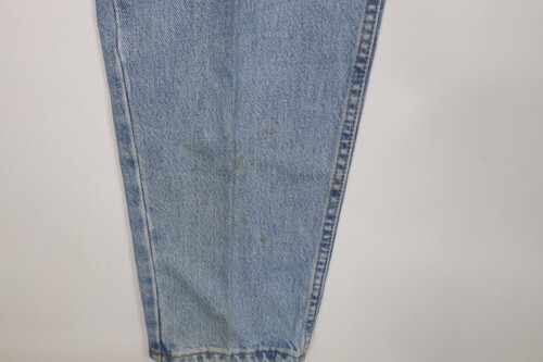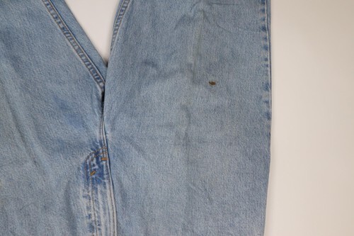 Stains front both legs. Dark spots back of legs. Waist, fly, cuffs discolored. Distressed and faded. Color faded. Made in USA
