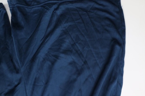 Mended rip back left. Dark spots front of legs. Fabric pulls. Graphics, color faded. String distressed