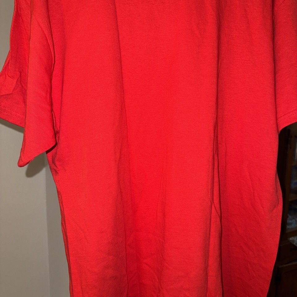This product is a vintage 90s Peanuts Christmas snowman holiday t-shirt for adult men in size large. The shirt features a festive red color with a Christmas theme, showcasing the beloved Peanuts characters. Perfect for fans of the Peanuts franchise, this t-shirt is a nostalgic and colorful addition to any holiday wardrobe.