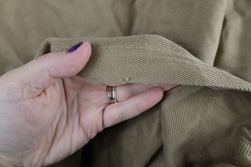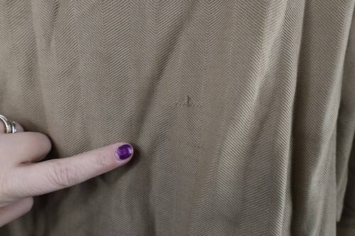 Missing middle button on the collar. Fabric pulls front middle right and bottom