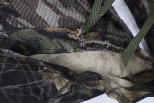 Mended rip right cuff. Left cuff is frayed some. Color faded. Pilling. Strings distressed. Buckles tarnished. Loose threads waist. Made in USA