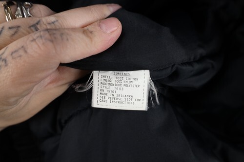 Stains on collar. Hole right arm. Blemished/discolored throughout. Cuffs worn. Collar, cuffs discolored. Color faded. Pilling