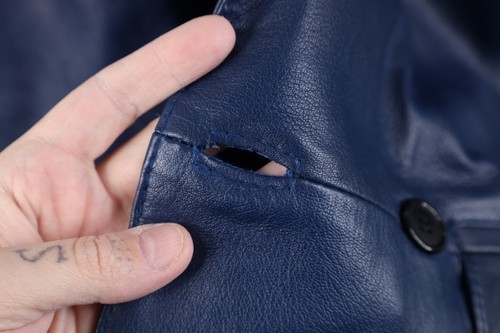 Blemishes throughout. Collar, cuffs, inner lining discolored. Button holes distressed. Color faded. 20.5 inches shoulder to shoulder seam. 26.5 inches shoulder seam to cuff