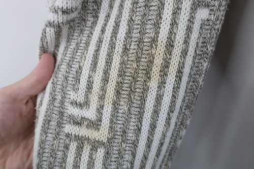 Stains/blemishes front, arms, tag. Collar, cuffs discolored. Color faded. Pilling. Loose threads buttons, front
