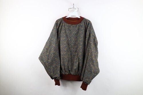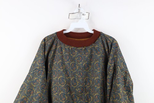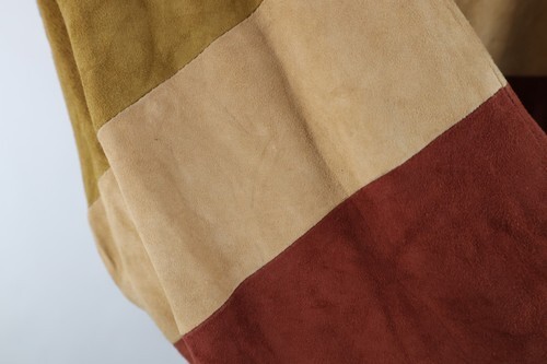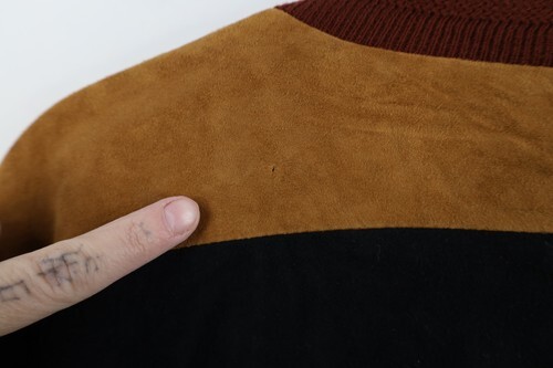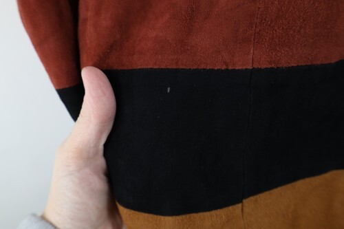 Reversible. Striped side: Stains front, shoulders, arms. Hole back top. Blemished/discolored throughout. Collar, cuffs discolored, pilled. Paisley side: Color faded. Silk material on paisley side, suede leather on striped side