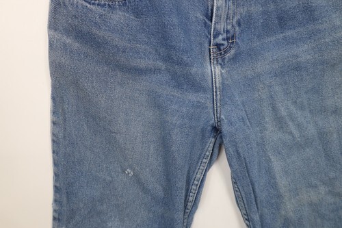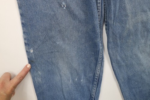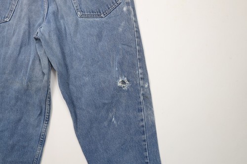 Holes front and back of the right leg. Distressing throughout. Distressed and faded. Cuffs ripped