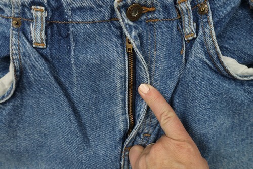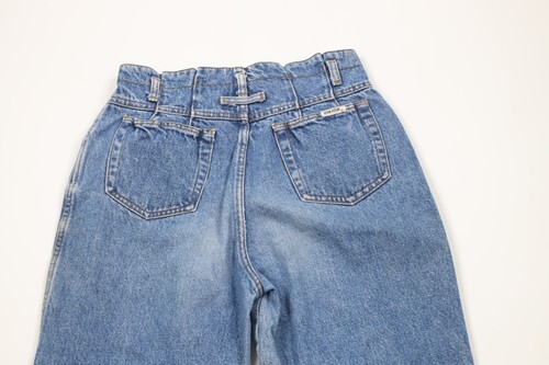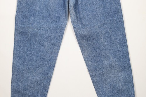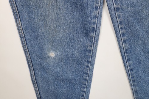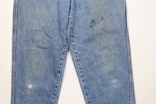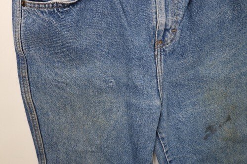 Waist hemmed in. Hole right leg an inner waistband. Stains front and back. Distressed and faded