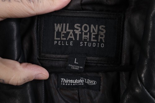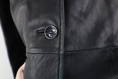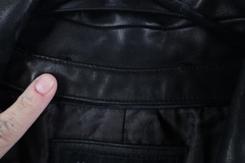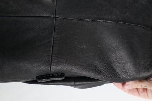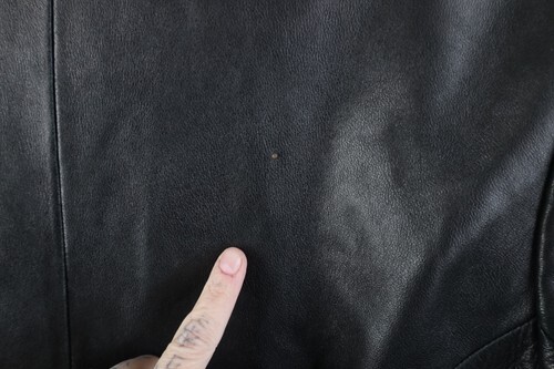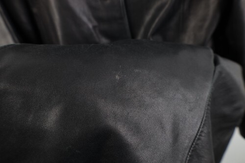 Missing strap. Peeling spots front. Stains/blemishes throughout. Worn/discolored front, collar, cuffs. Color faded. Distressed and faded. Inner lining discolored. Piece cut out inner collar