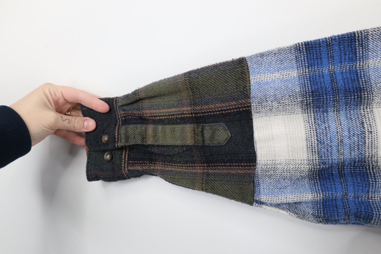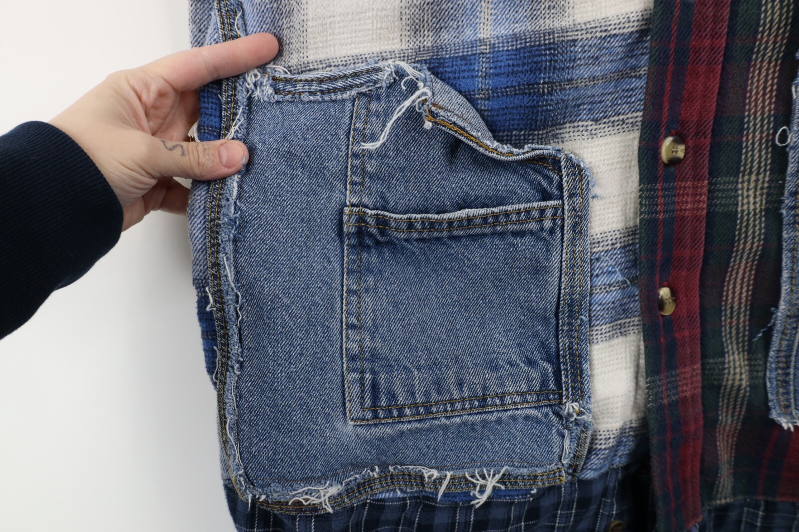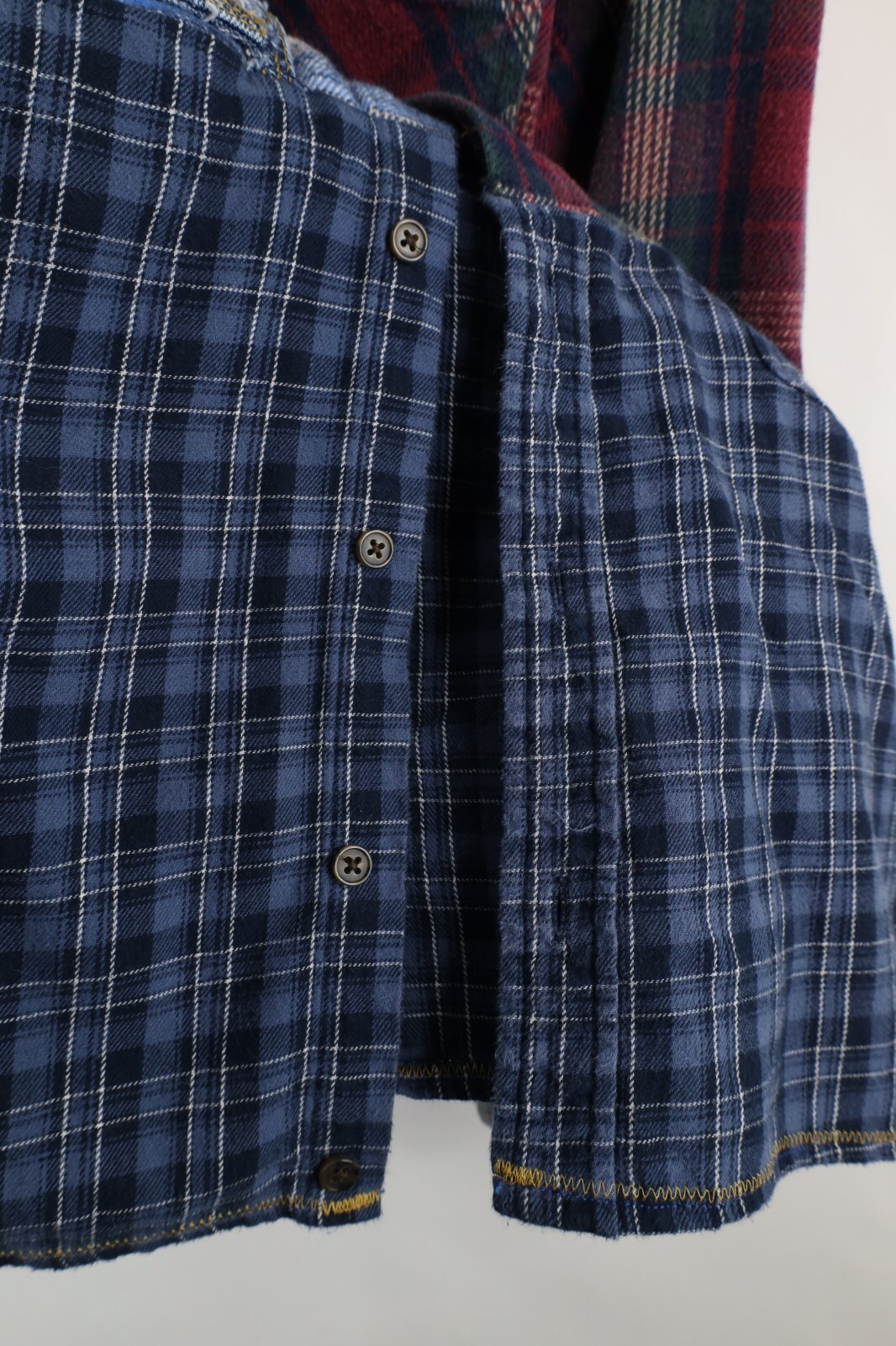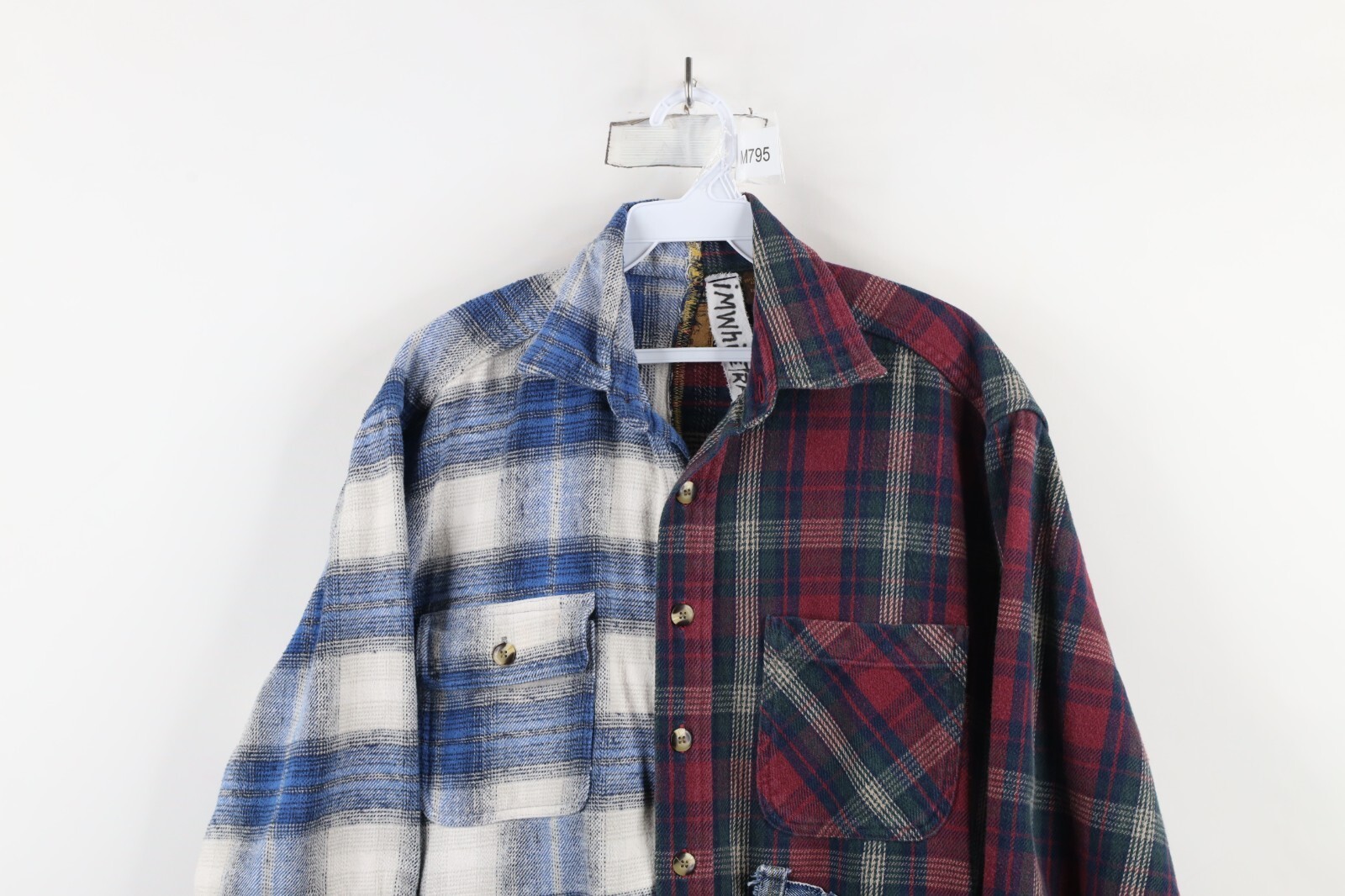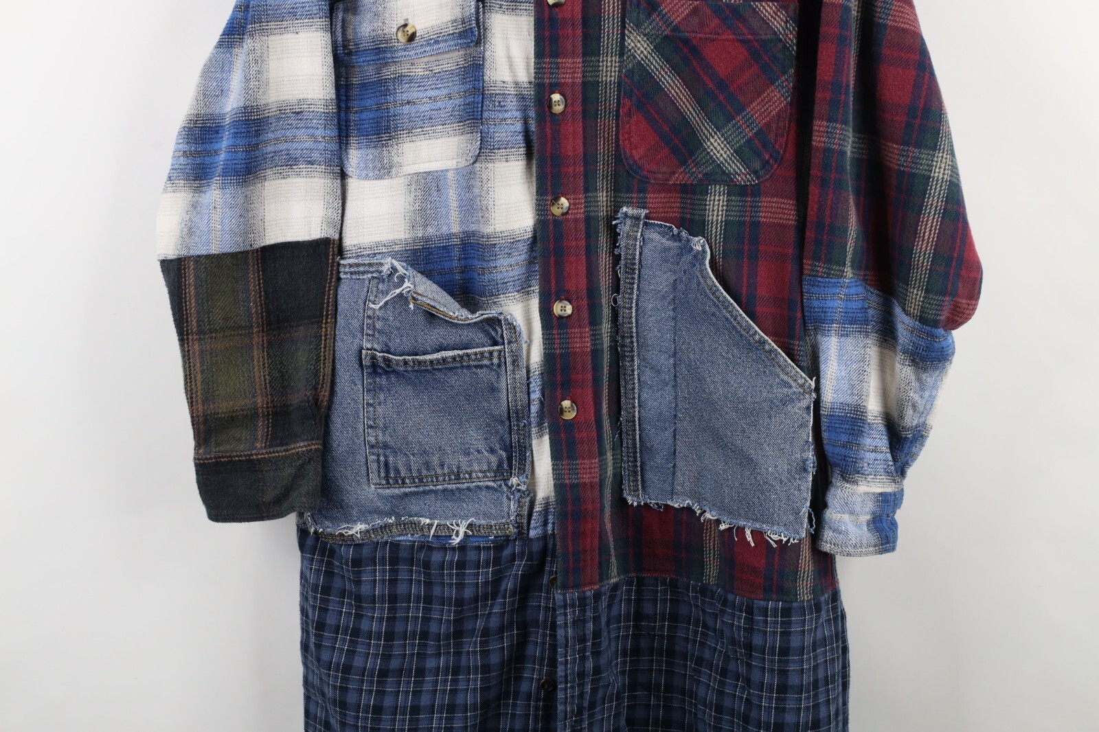 Multiple shirts sewn together. Pockets distressed, frayed/loose threads. Color faded. Pilling. Buttons do not line up toward bottom. Home-made tag inner collar