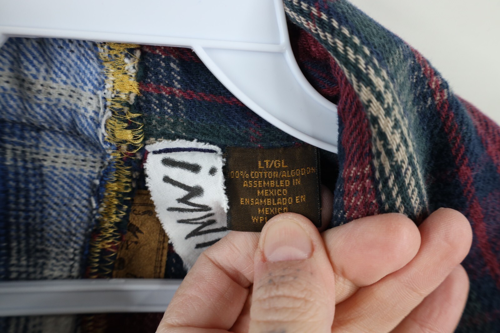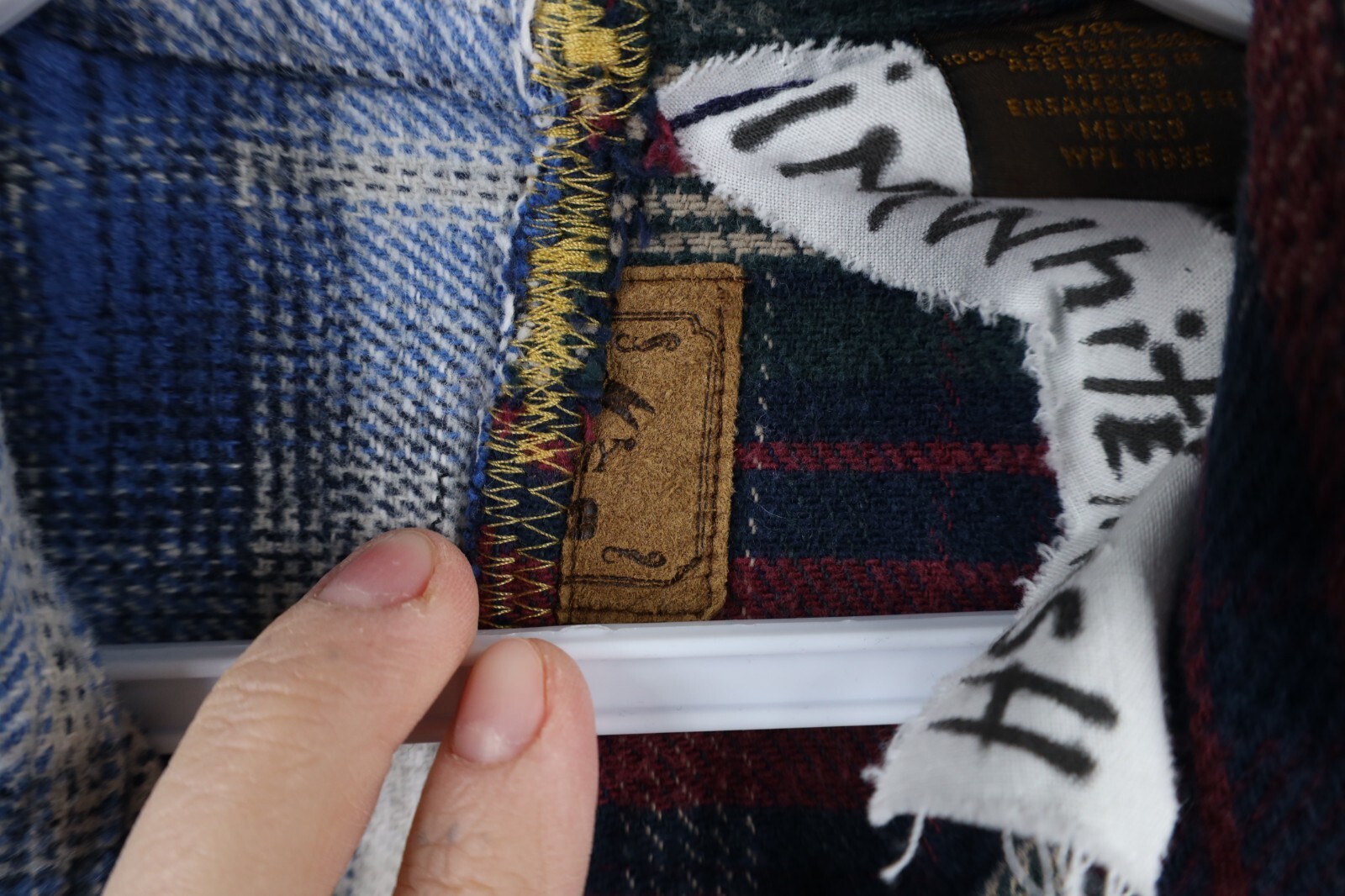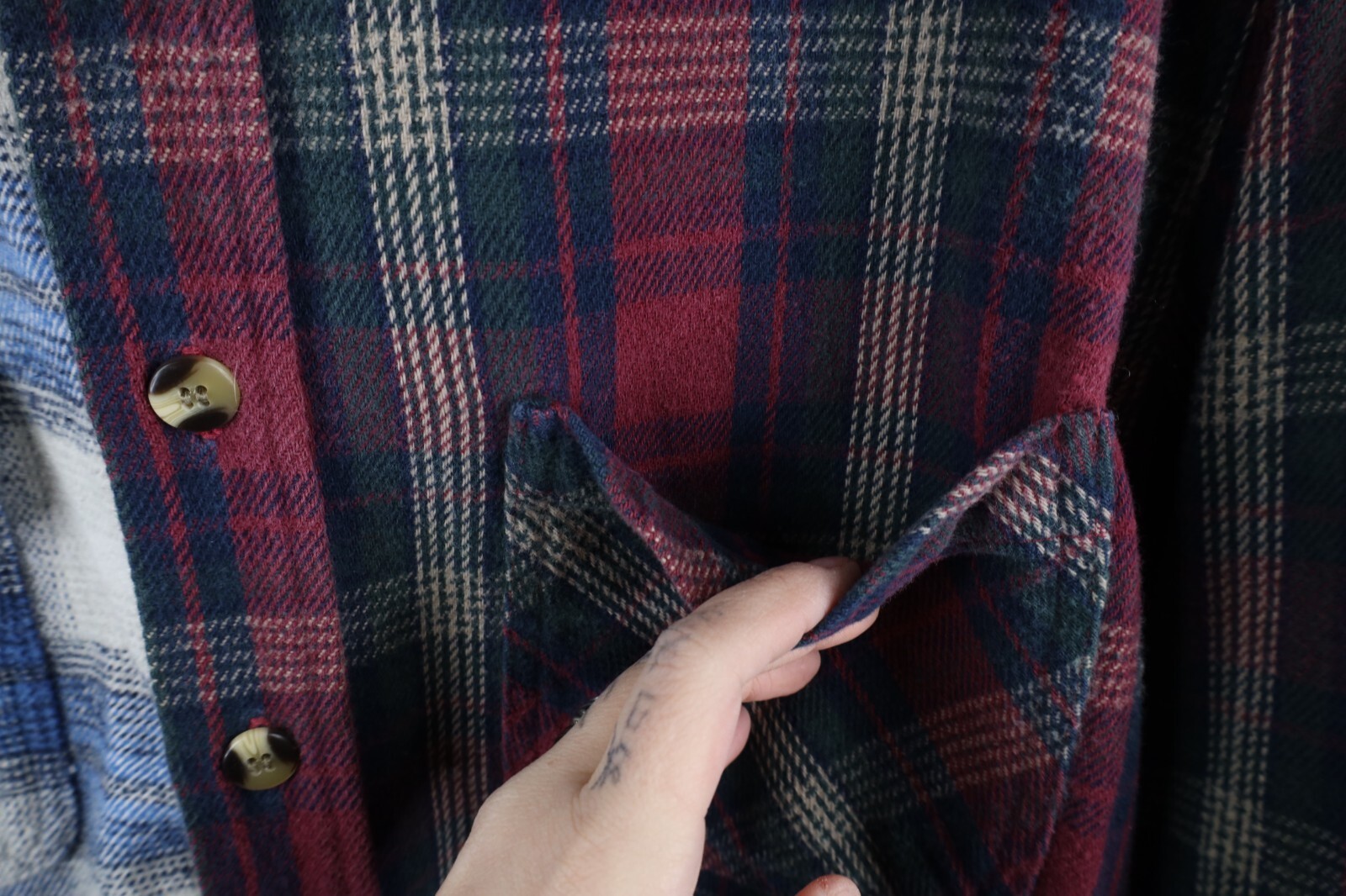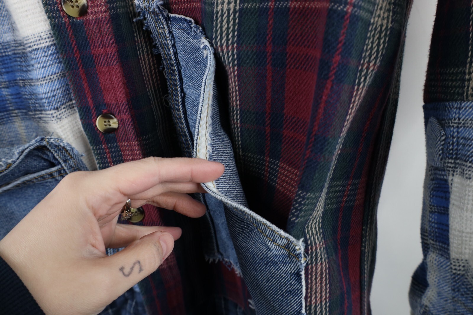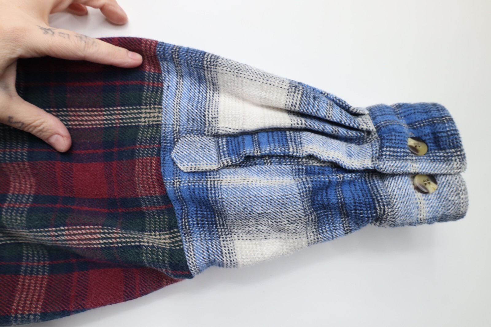 Multiple shirts sewn together. Pockets distressed, frayed/loose threads. Color faded. Pilling. Buttons do not line up toward bottom. Home-made tag inner collar