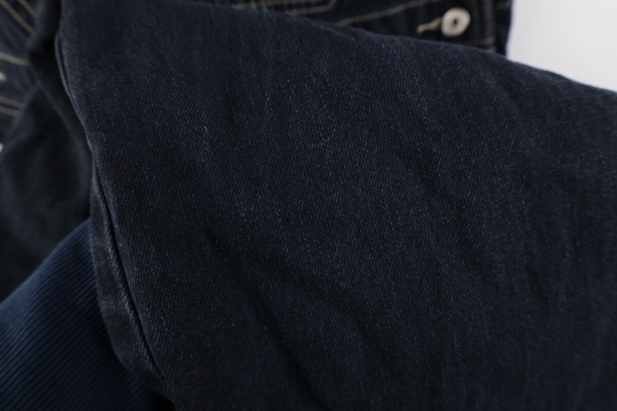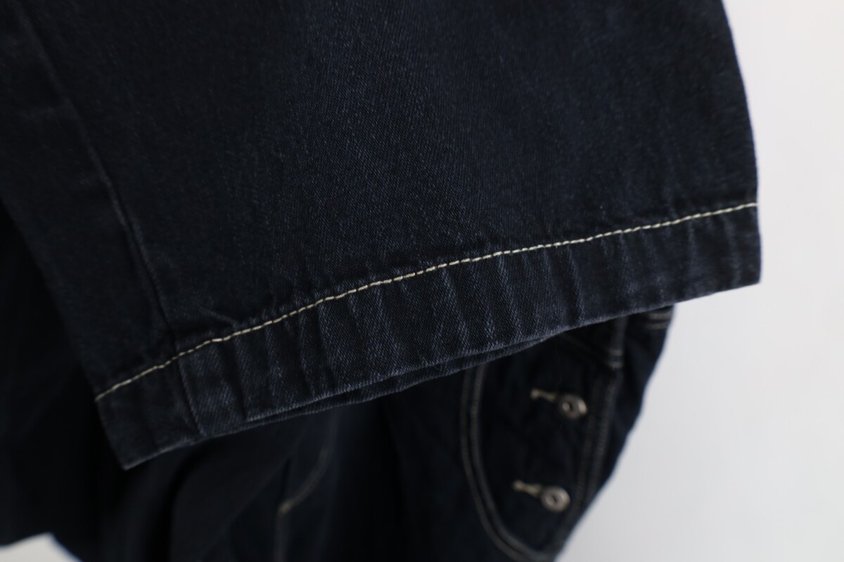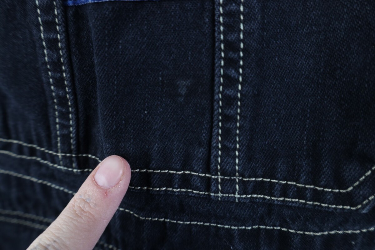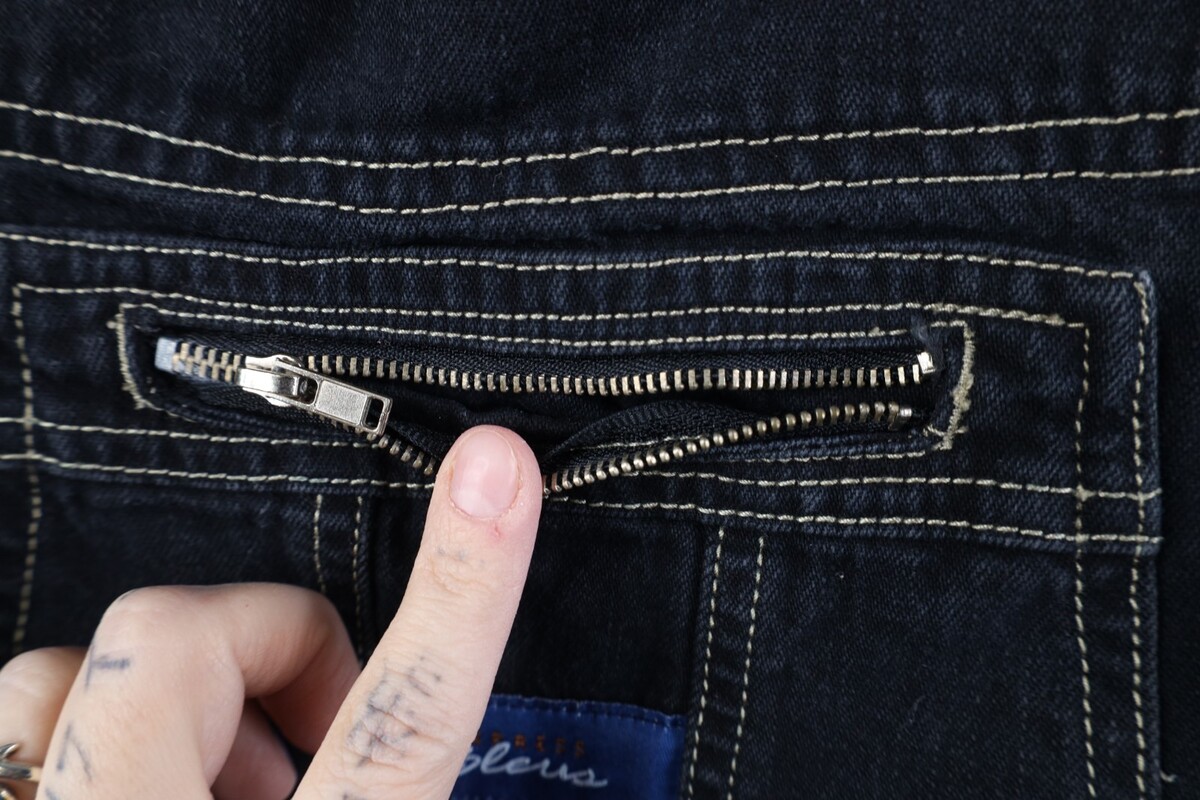 Stain front top pocket. Blemishes, discoloring throughout. Cuffs discolored. Color faded. Zipper tarnished