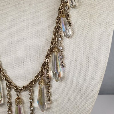- Vintage ANN Taylor Aurora Borealis Bead Dangle Prizm Crystal Gold Tone Necklace