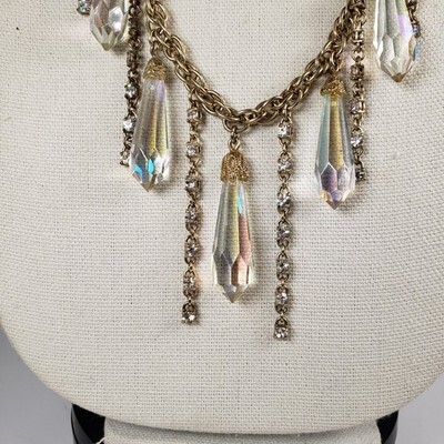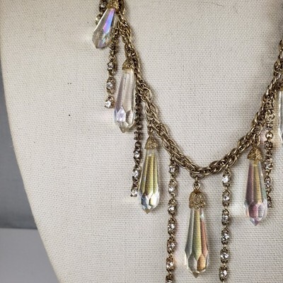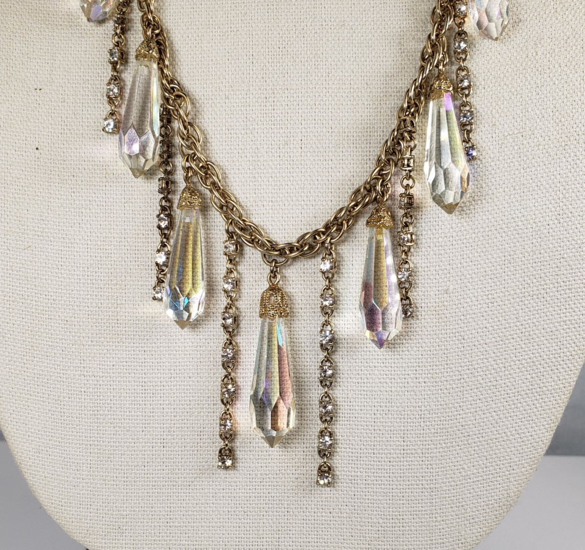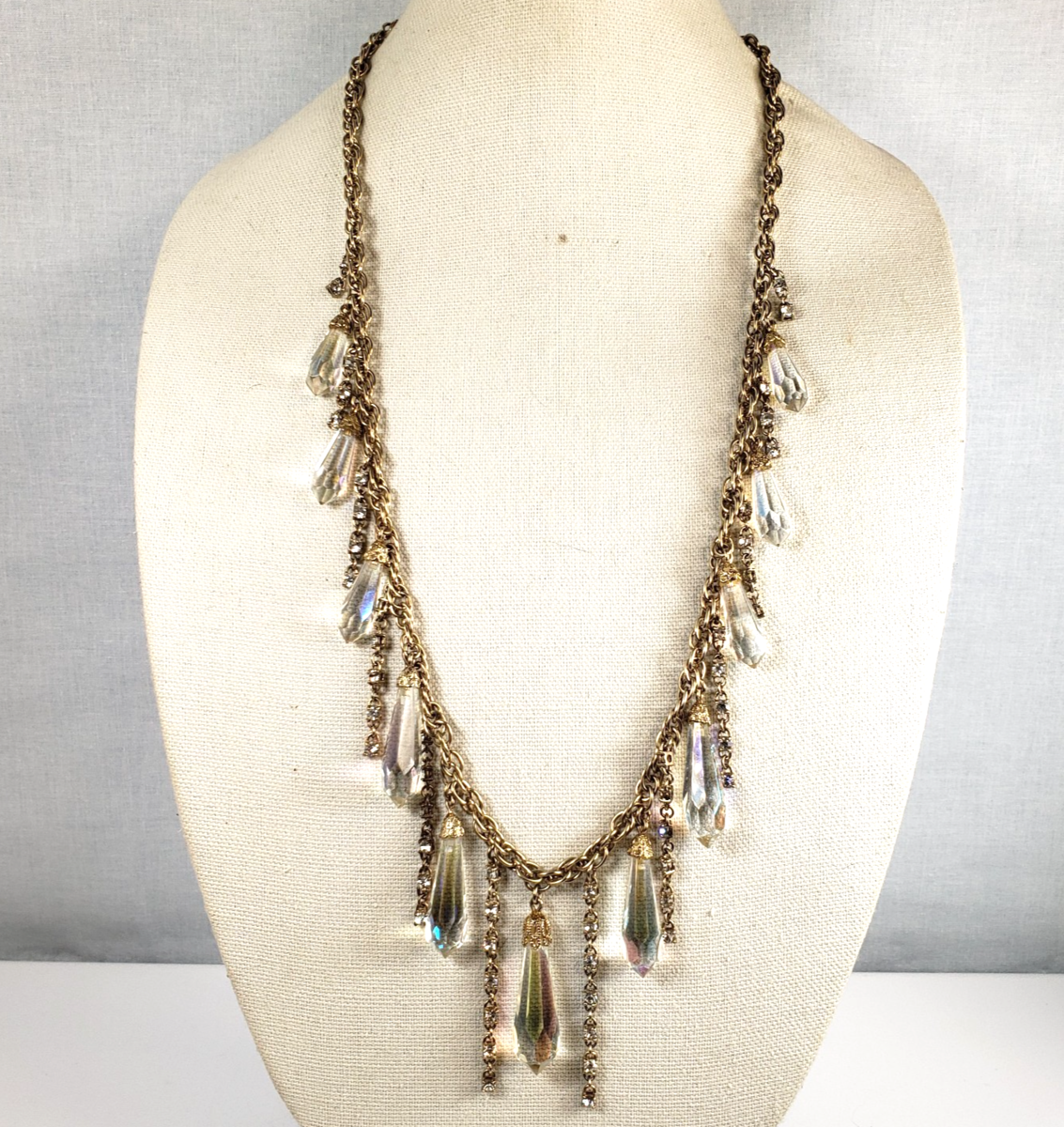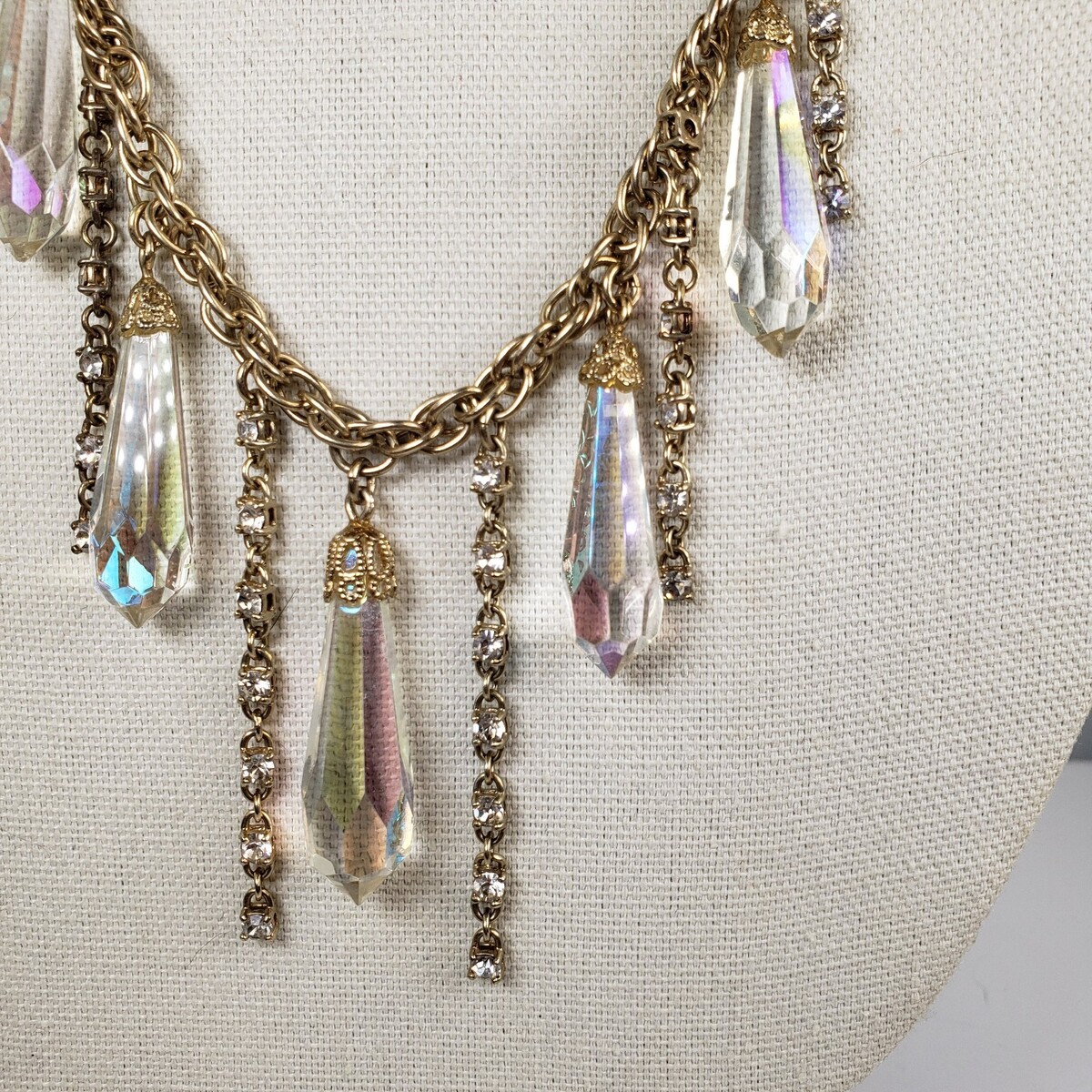 Vintage ANN Taylor Aurora Borealis Bead Dangle Prizm Crystal Gold Tone Necklace