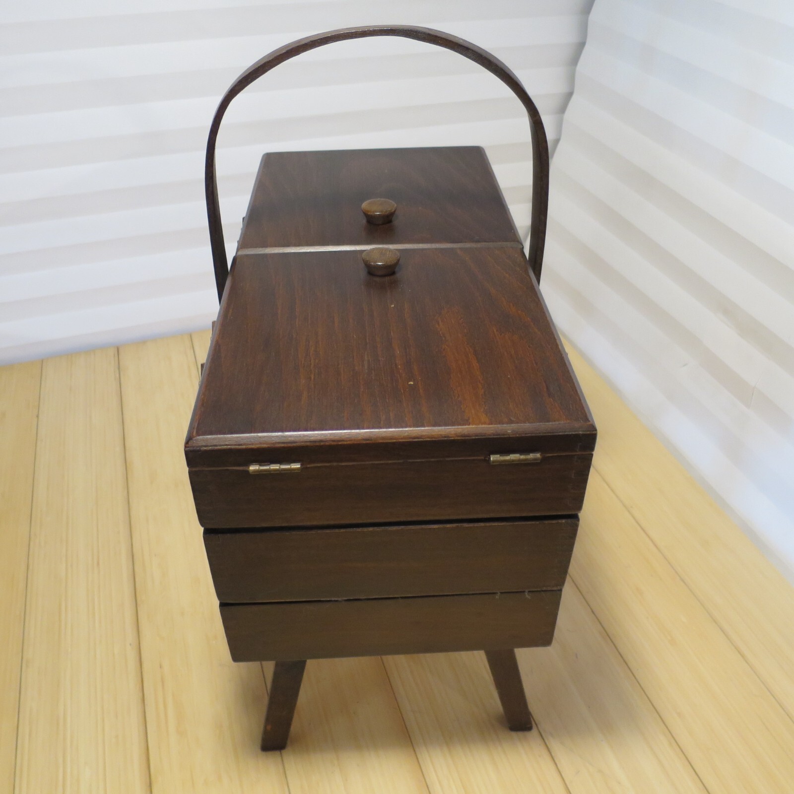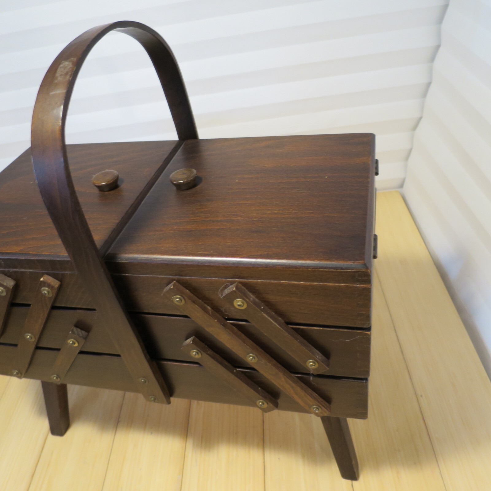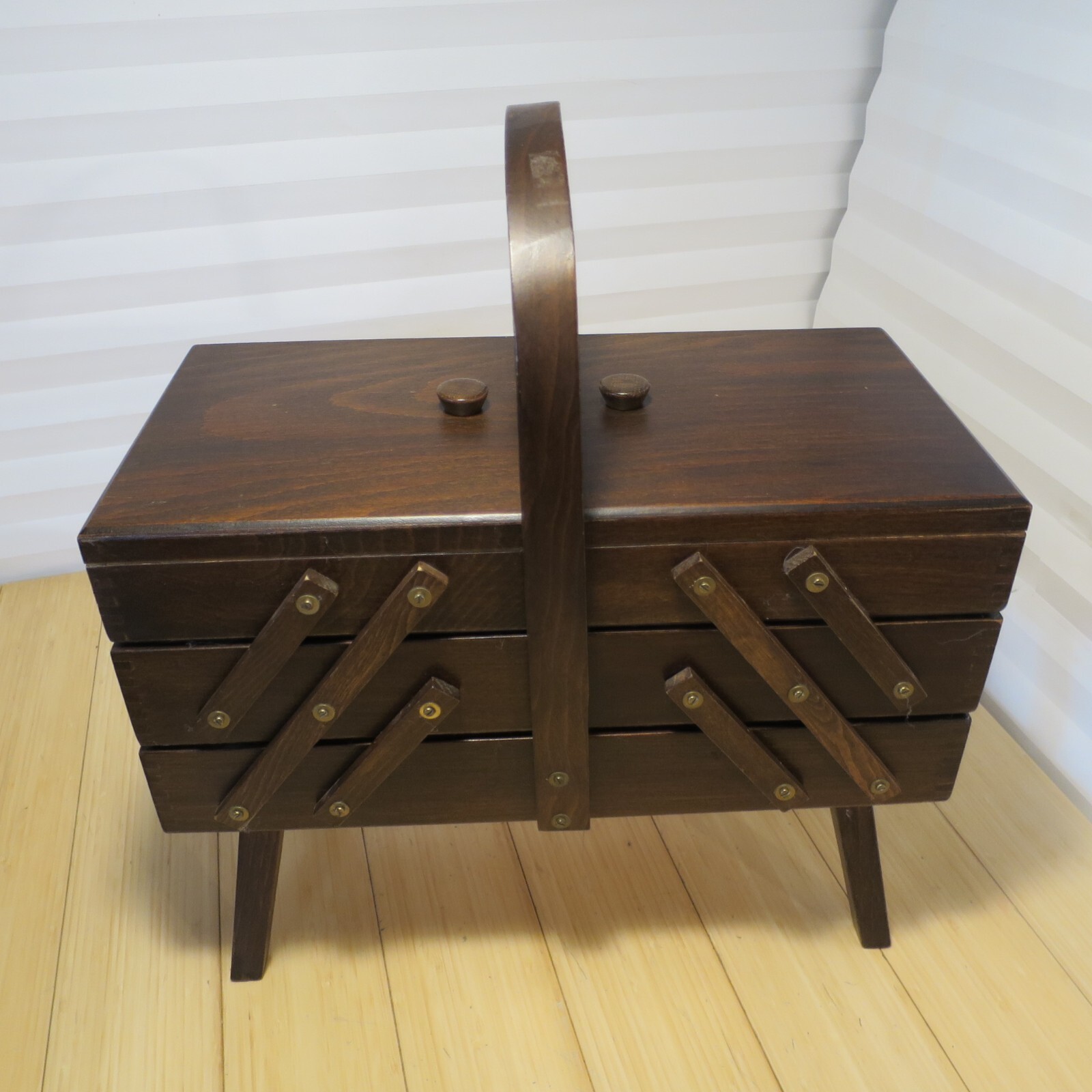 - Vintage Accordion Sewing Box Dark Wood Expandable Organizer Mid Century Romania