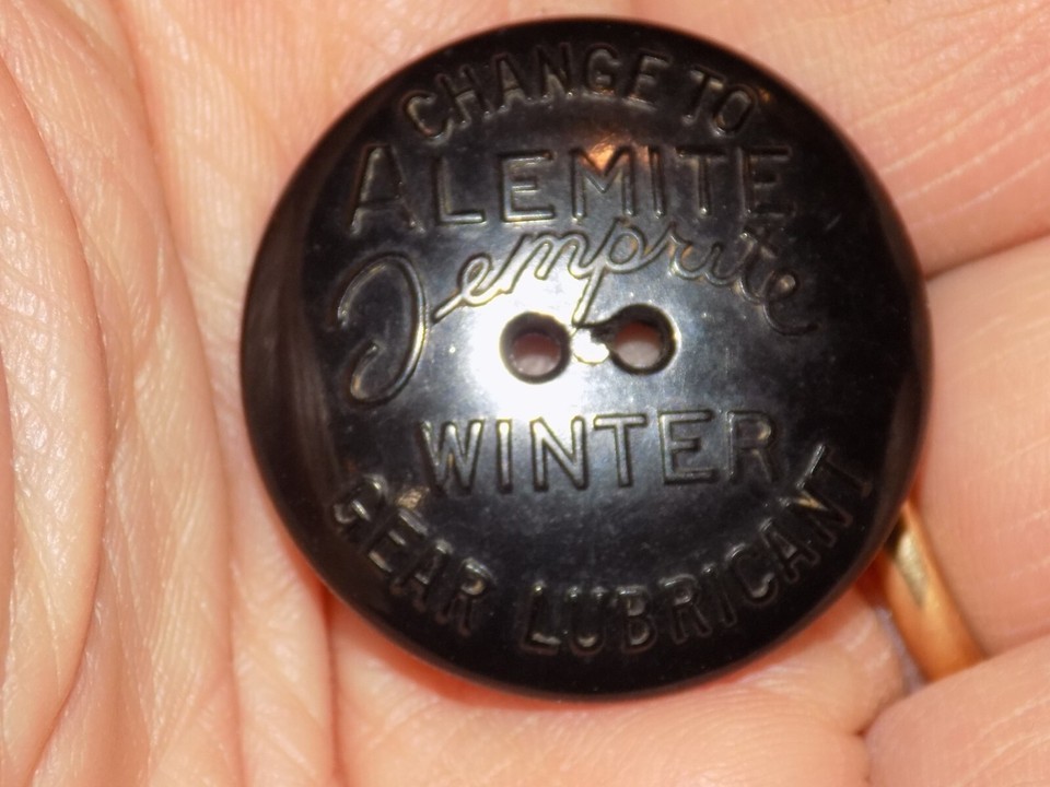 - Vintage Alemite Winter Gear Lubricant Plastic Advertising Embossed Button