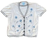 Soft vintage Alfred Dunner cardigan featuring embroidered blue floral designs with black trim accents. Button front, short sleeves, and lightweight knit for year-round wear. Size Large. Some small pinholes noted (see photos). Made of 55% acrylic, 45% cotton. Perfect for cottagecore wardrobes, layering, or retro everyday style.