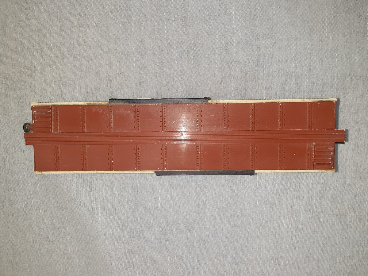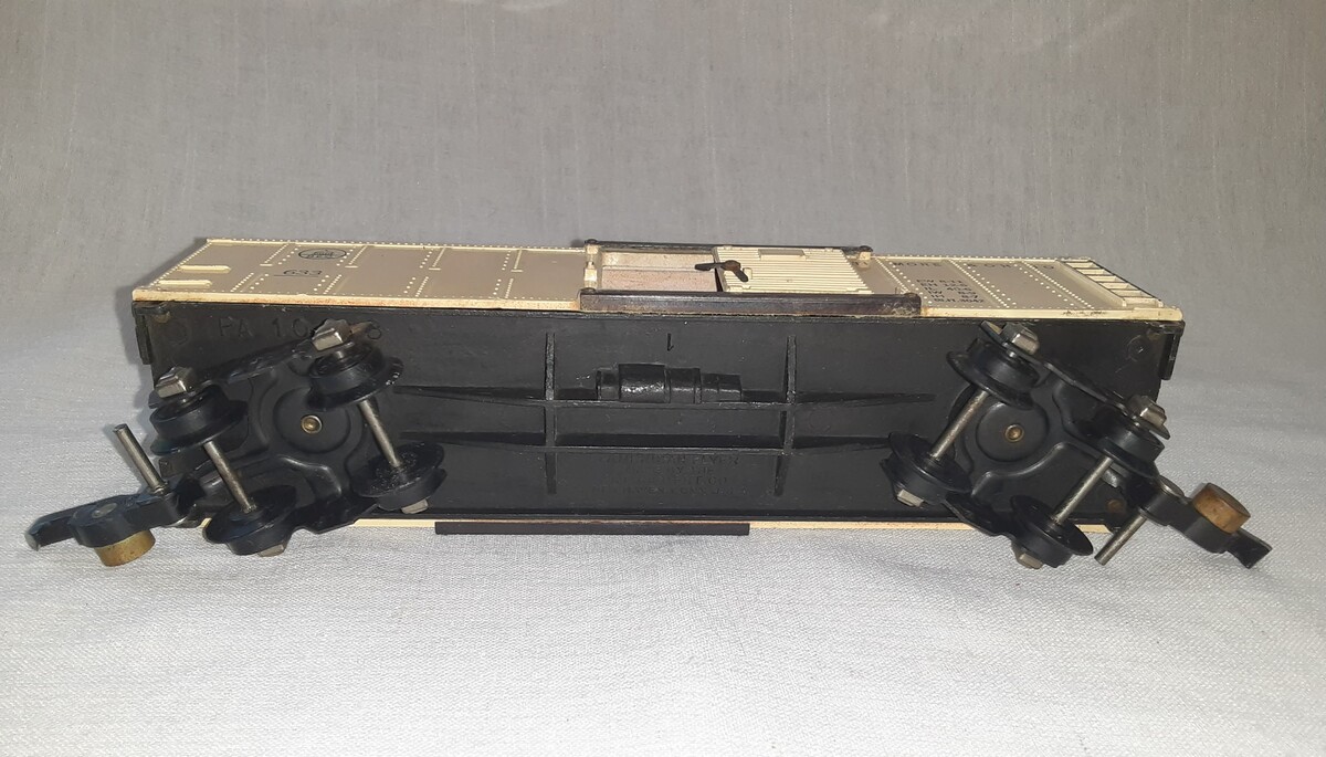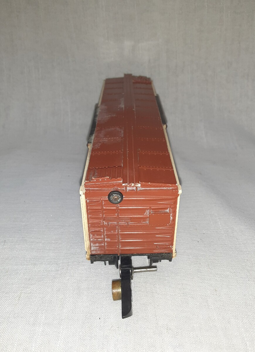 This is a Vintage American Flyer #633 Baltimore Ohio Boxcar. It is painted an off white color with Tuscan red top and ends. The roof appears to be a bit warped in the middle. There are a few small spots where the paint has worn off. It has moving doors with black metal latches. This car has link couplers. It may need cleaned. I do not have the original box for it.