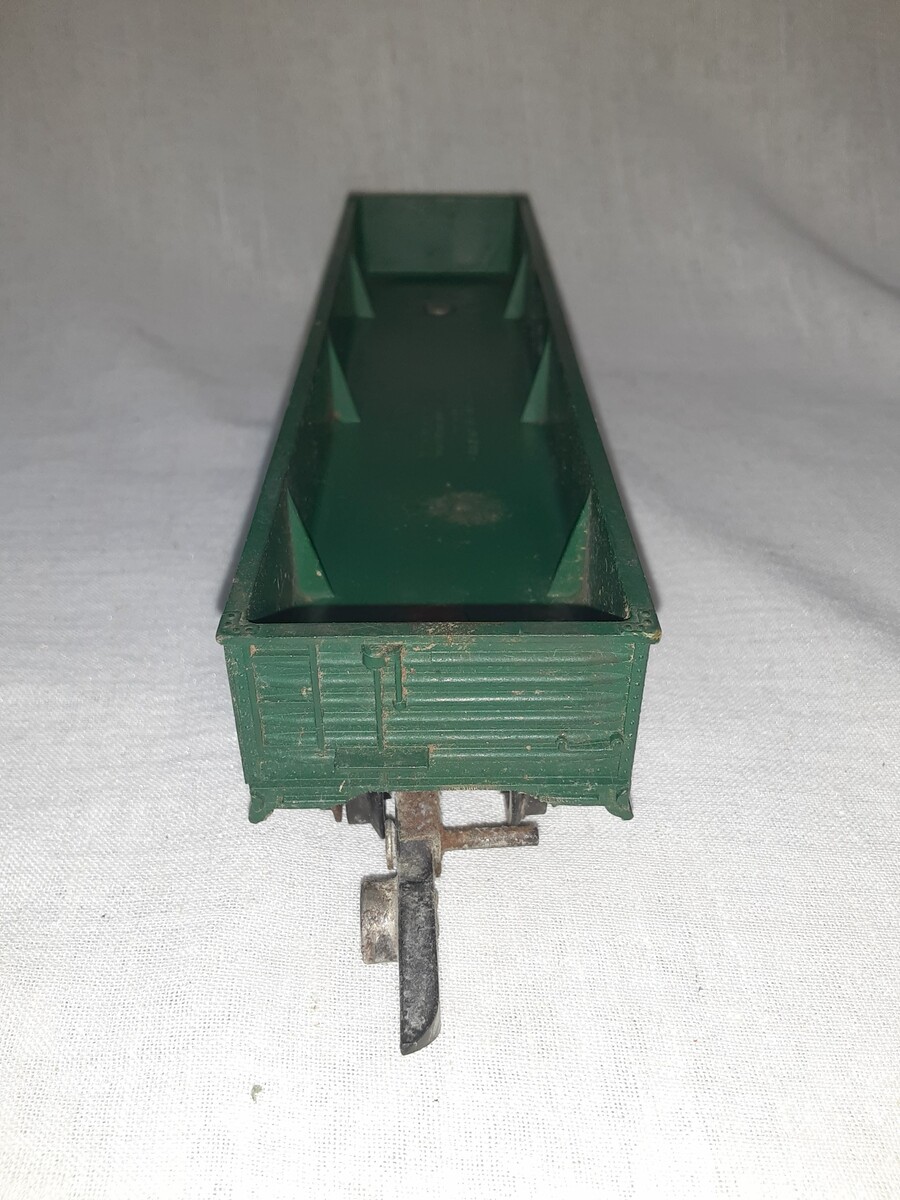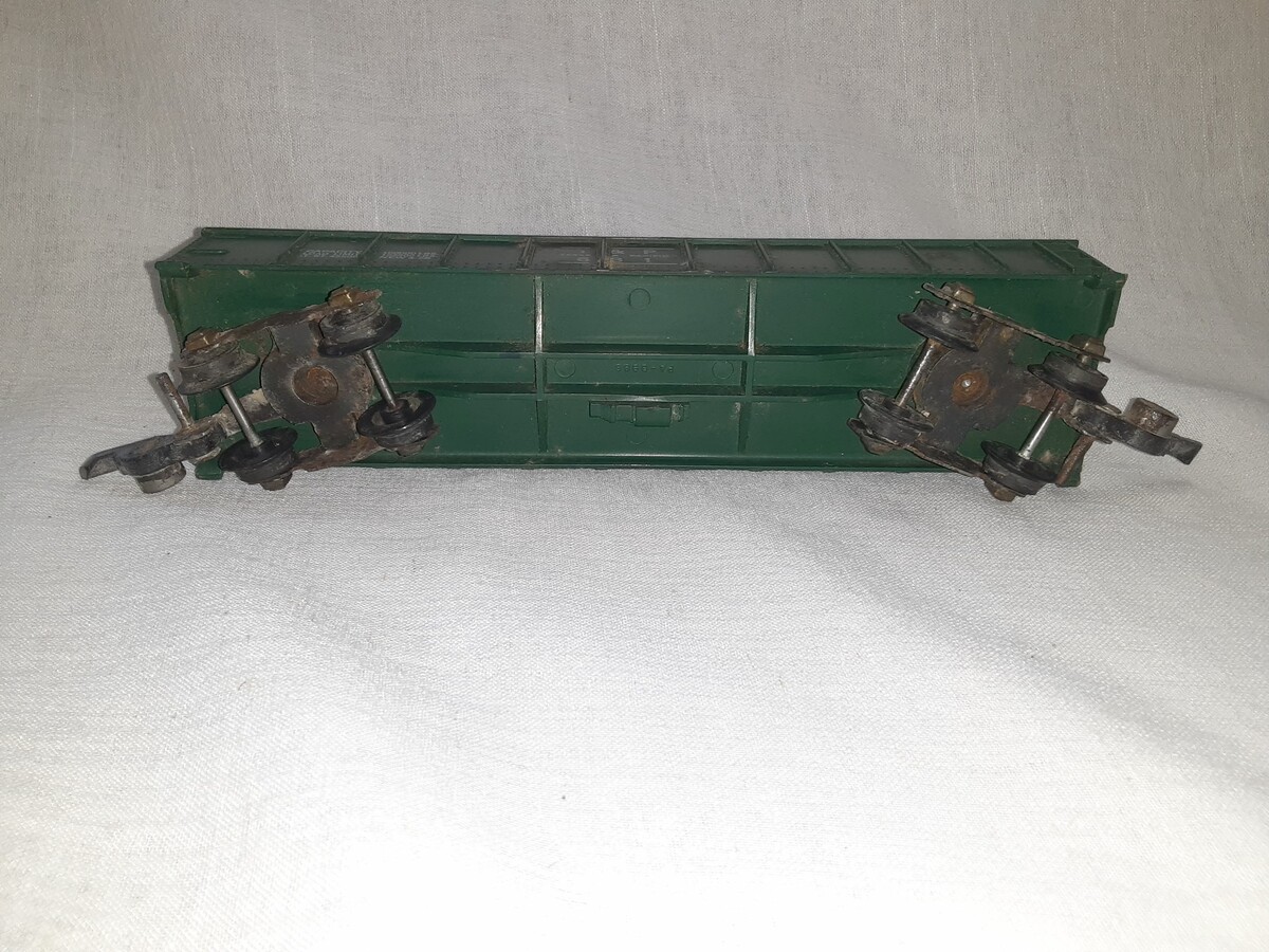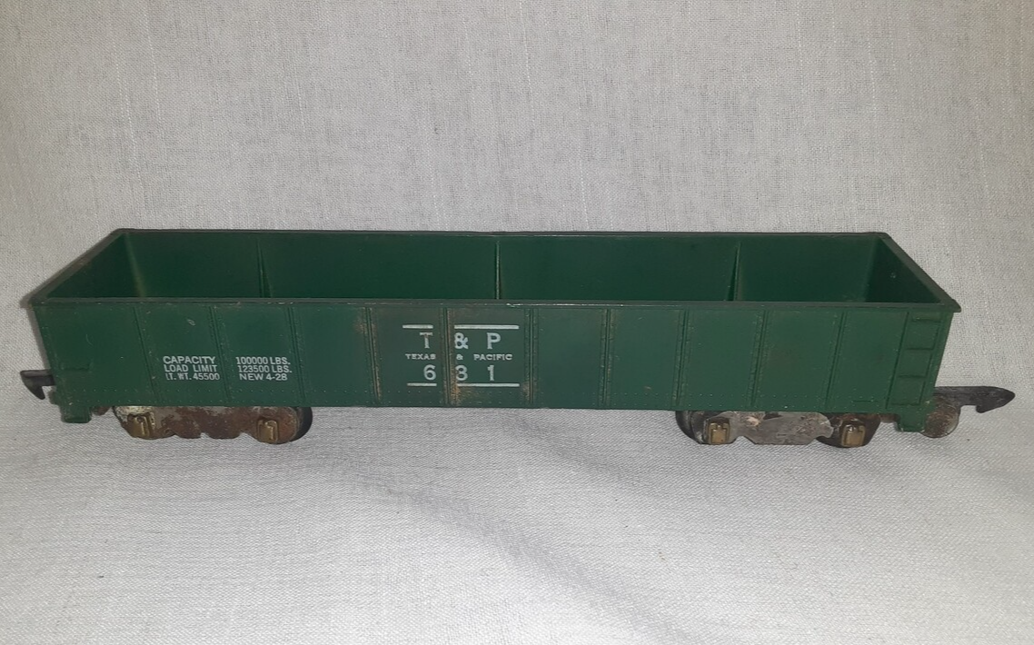 This is a Vintage American Flyer No. 631 Texas Pacific Gondola with Link Couplers. This item is unpainted green and is in good condition for its age. It may need cleaned. I do not hae the original box for this item.