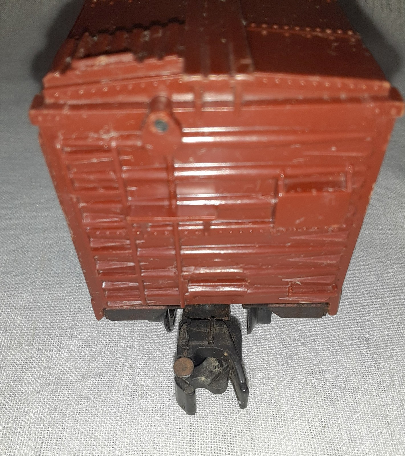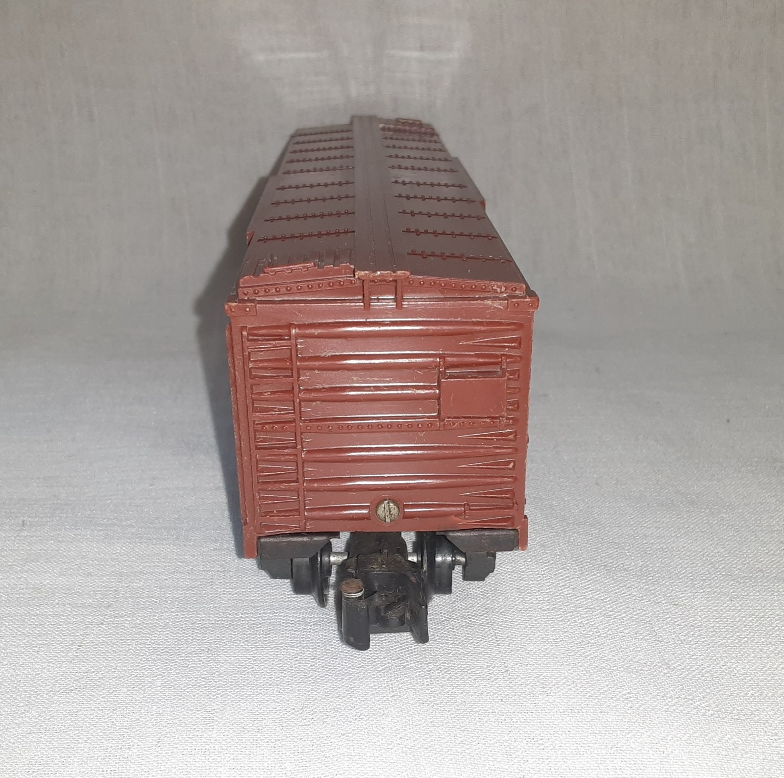 This is a Vintage American Flyer No.803 A.T.S.F. "The Chief " Santa Fe Box Car. It is unpainted Tuscan red and has knuckle couplers. The brake wheel is missing from the back end and there is a bit of rust on the underside. Otherwise, this item is in good condition for its age. It will need cleaned. There is no box for this item.