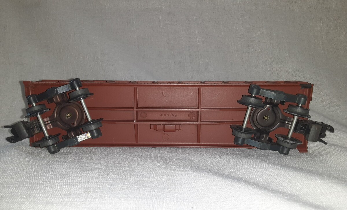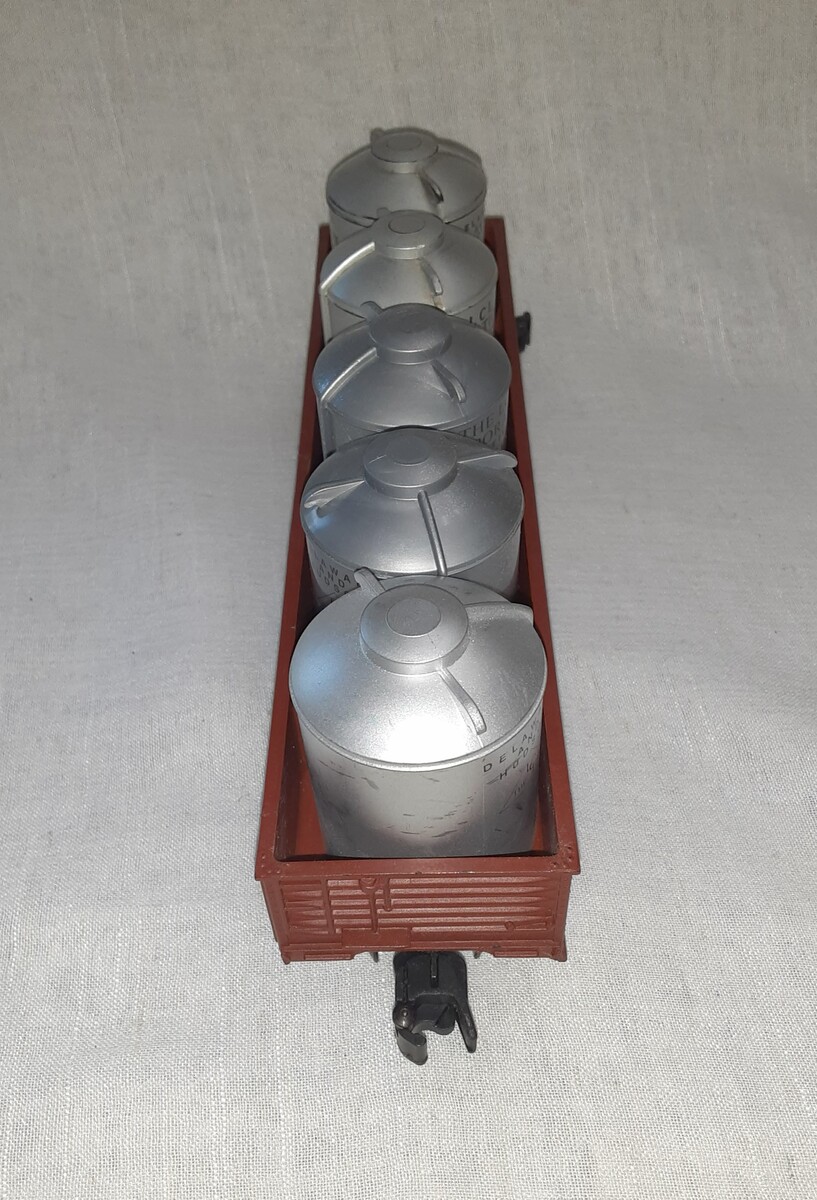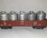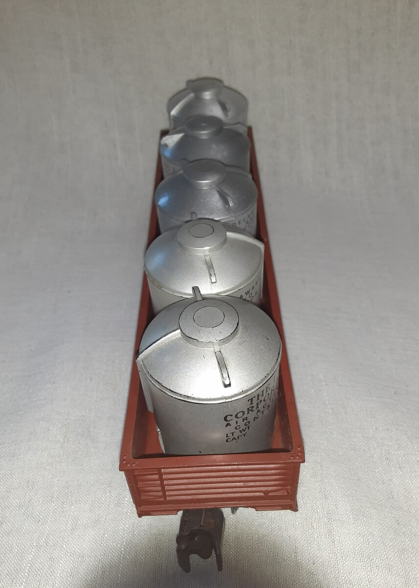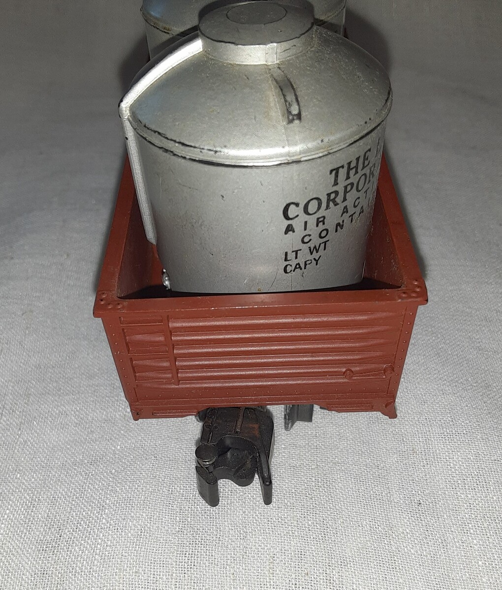 This is a Vintage American Flyer No.916 Delaware Hudson Type II Gondola with 5 silver canisters. It is painted Tuscan Red and it has knuckle couplers. The step is missing at the bottom of two corners. Some of the canisters have scratches on them. Otherwise this item seems to be in good condition for its age.