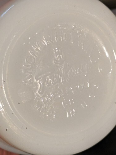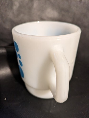 This vintage Anchor Hocking Fire King stacking coffee mug features a playful blue polka dot pattern and is made of durable glass material. It has an impressed backstamp and is an original piece from the United States. Ideal for all occasions, this coffee mug is perfect for adding a touch of vintage charm to your decor. The production style of this mug is milk glass and it is a part of the Fire King product line. This is a must-have for any collector of vintage mugs and decorative cookware.