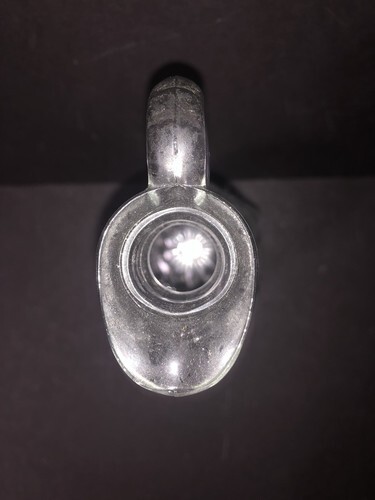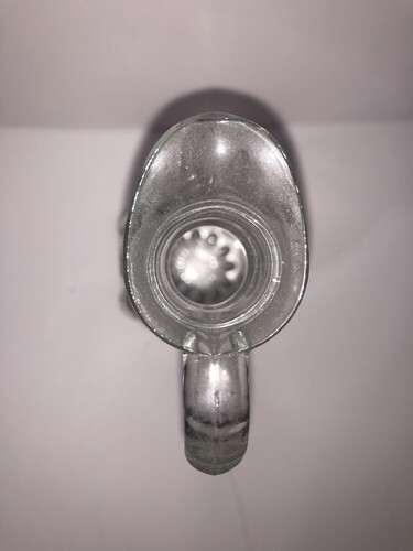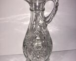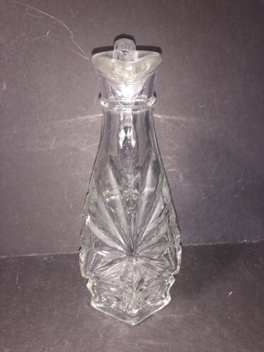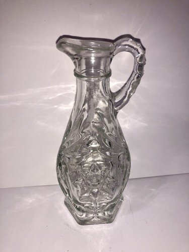 The Vintage Anchor Hocking Star of David Vinegar Cruet Vase Pour Bottle is a unique and decorative piece made of clear glass. This original cruut features a pressed glass production style with a fused glass technique, showcasing intricate Star of David pattern. Crafted in the United States in the 1960s, this 6.25-inch tall cruet is perfect for serving vinegar or other liquids at the dining table or as a decorative piece in any home.