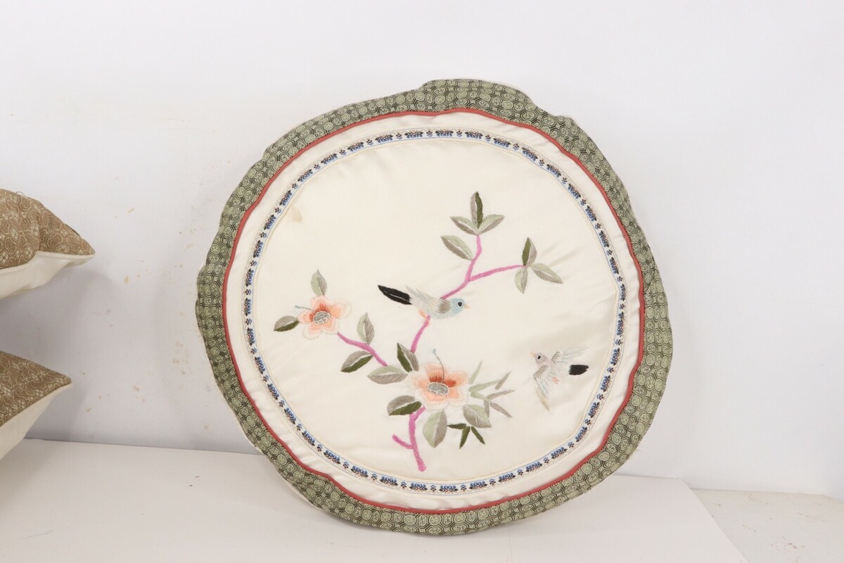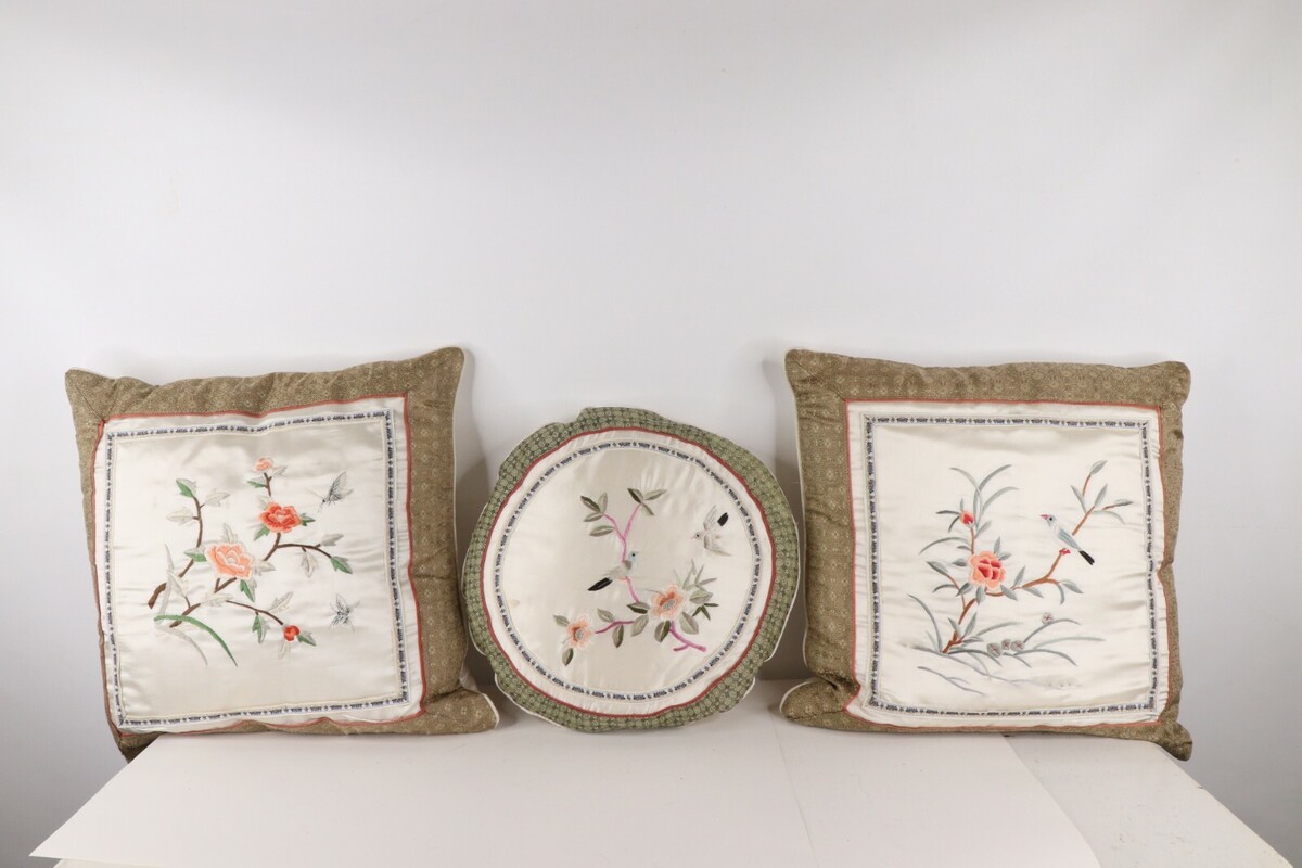 - Vintage Antique Lot of 3 Satin Embroidered Finch Bird Floral Throw Pillows 16x16