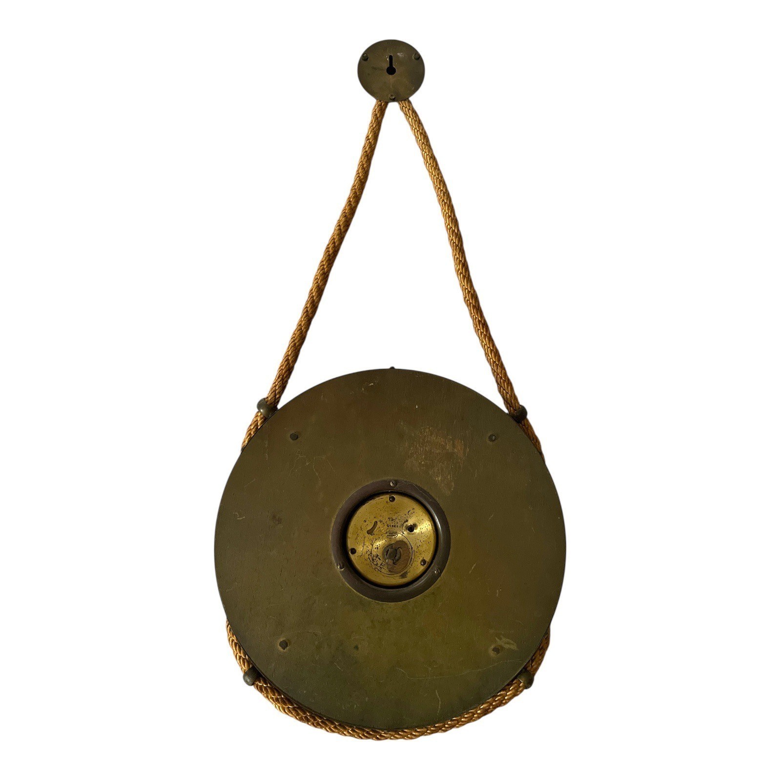 This vintage Atlanta wall clock features a 7-jewel, 8-day wind-up movement made in Western Germany by F. Mauthe, a respected German clockmaker. The clock has a striking nautical-inspired design with a rope-wrapped case and hanger, brass accents, and a glass-covered dial. Roman numerals and gold-tone hands complete the classic mid-century look.