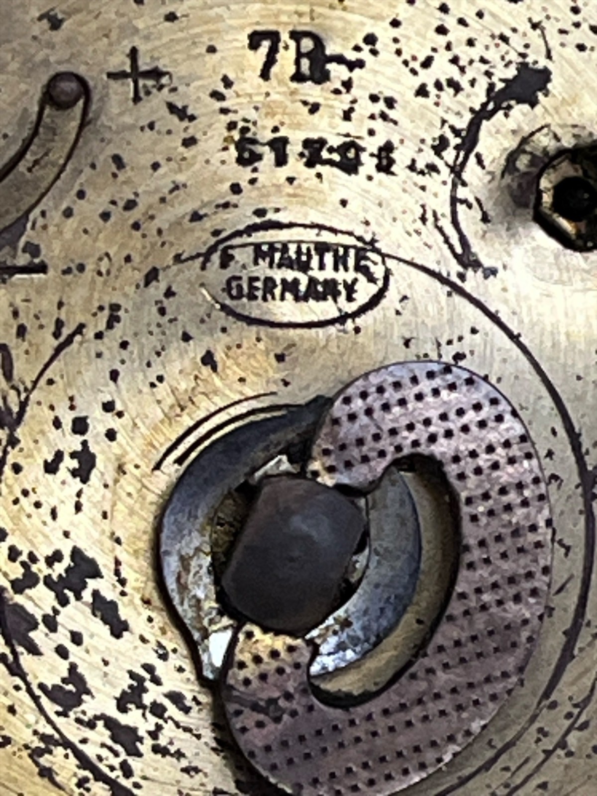 The dial is marked ?Atlanta? with 7 Jewels ? 8 Days, and the back brass plate is stamped F. Mauthe Germany, confirming the movement?s maker. This is a mechanical, key-wind clock (not battery operated). It currently appears to have been overwound and is untested, but remains an excellent decorative piece for vintage, nautical, or mid-century interiors.
