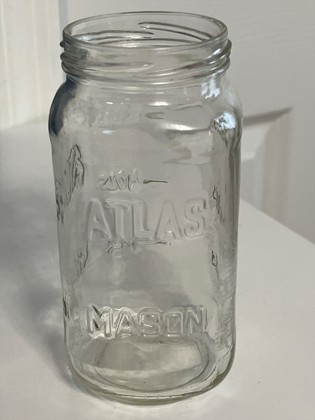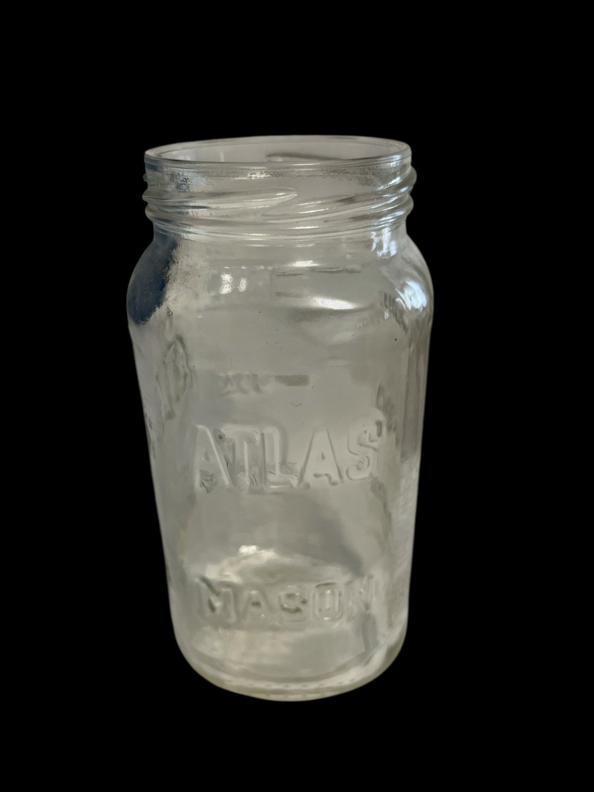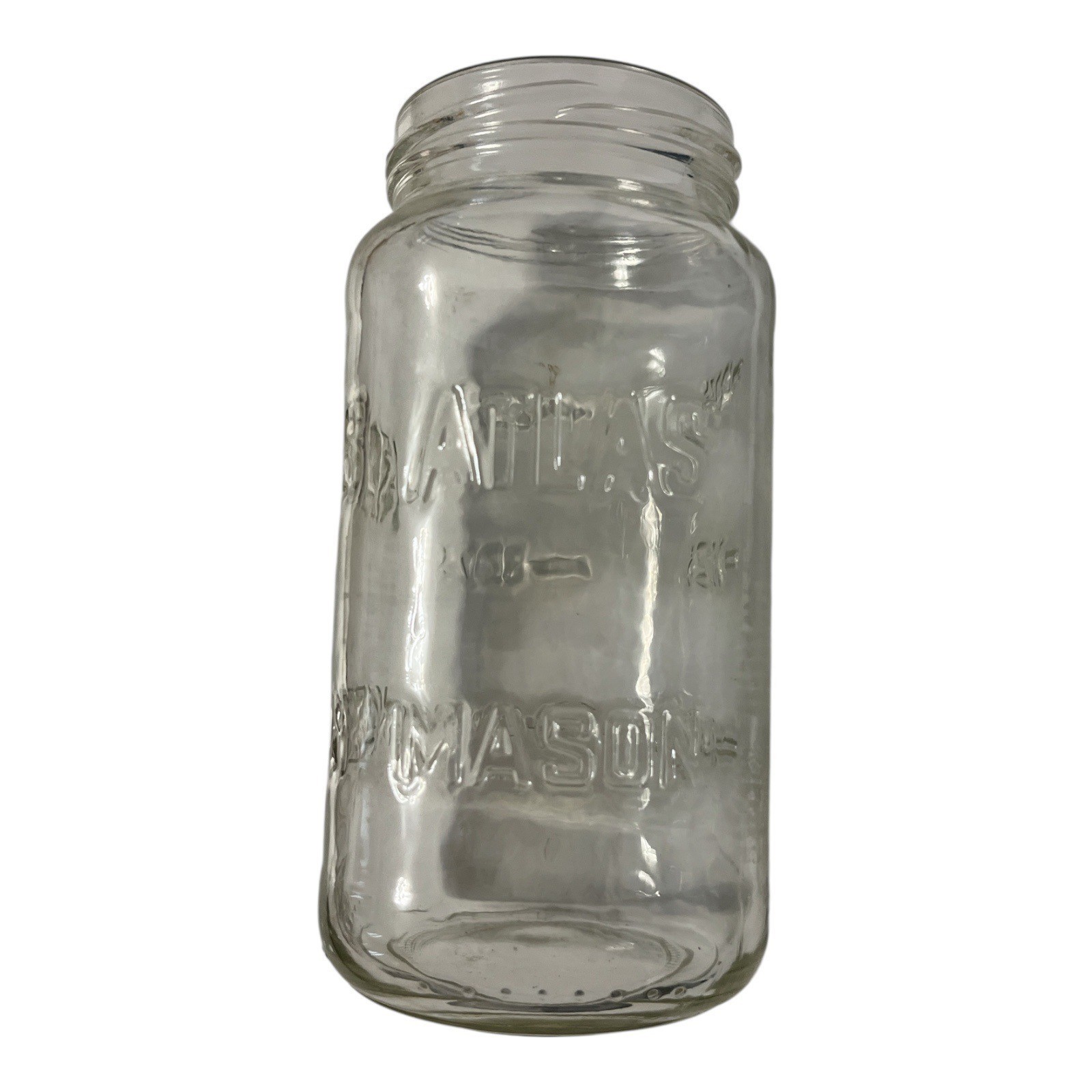 This is an authentic vintage Atlas Mason jar, embossed with the classic Atlas Mason lettering. Dating from the mid-1900s, this clear glass jar is perfect for collectors, rustic kitchen decor, or creative repurposing.