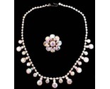Beautiful vintage fiery aurora borealis rhinestones necklace and matching brooch with prong-set stones. The vintage necklace is 15? long x 3/4? wide and the matching brooch is 1 1/8? x 1 1/8?. Both are in excellent condition. They have an unusual goldtone backing.