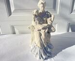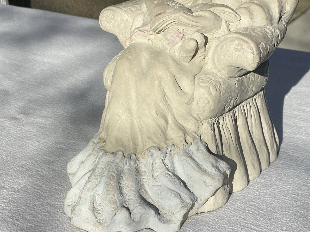 The Vintage Austin Productions "Reading A Book With Child" Sculpture by artist Alice Heath is a medium-sized statue originating from the United States in 1989. This original piece showcases a charming Victorian and Art Nouveau style, featuring a Victorian lady reading a book with a child. The sculpture, signed by Heath, is made of plaster and paint in pastel multi colors, adding a touch of nostalgia to any table setting or art collection.